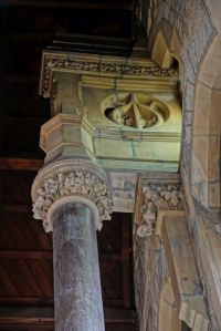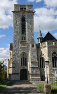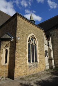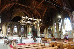 One of Edward Buckton Lamb’s bizarre low church designs featuring a wide nave, small chancel raised high above the nave and a spectacularly contrived wooden crossing. The church was built 1868 as an independent church which failed in 1872 when its founder Ben Oliel suddenly switched from evangelical to high church services. In 1878 it was sold to the Church of England and replaced a temporary building as the parish church. Completion came in 1928-30 when the tower was completed to a non Lamb design. A 1973 re-ordering has placed the altar under the central lantern below a corona by George Pace