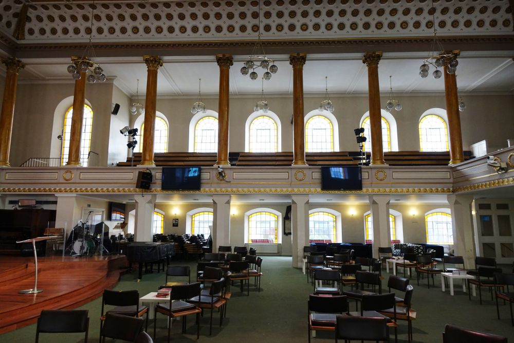 Next to Broadcasting House just north of Oxford Circus. The church was designed by John Nash and built 1822-24. It is a centre of evangelical Anglicanism.