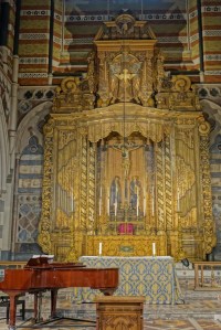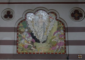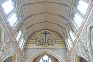 One of William Butterfield’s classic high Victorian designs. Built 1870-77, the striking interior decoration was largely reinstated in 1975, having been whitwashed over. The huge reredos is by Martin Travers from 1928 as are the Stations of the Cross.