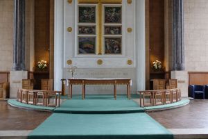 Islington parish church. The tower is from 1751-54 by Lawrence Downbiggin, the body of the church was rebuilt after the 2nd world war by Seely and Paget 1954-56. The focal points are the double pulpits and a reredos which holds 8 paintings by Brian Thomas.