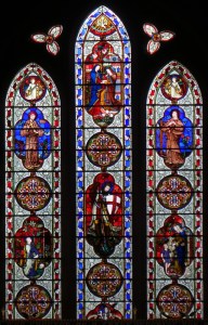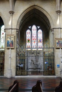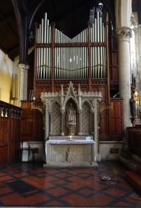 A vast church, the foundations were designed by Gilbert Blount but the body of the church was designed by Charles Alban Buckler 1874-83. The outer aisles are separately gabled and each is a side chapel representing one of the mysteries of the Rosary, just a selection of the glass, altar and decoration are shown.
