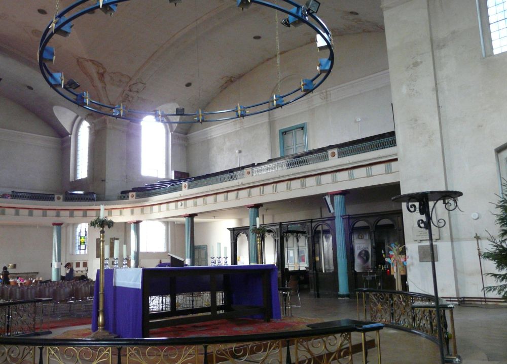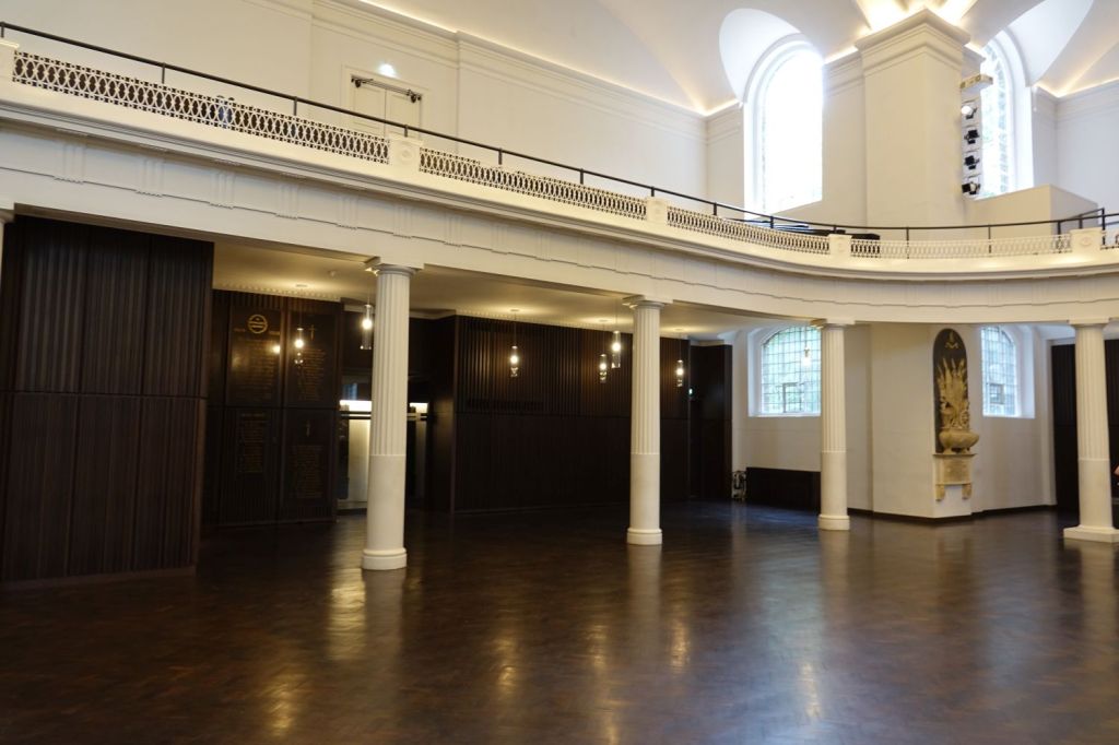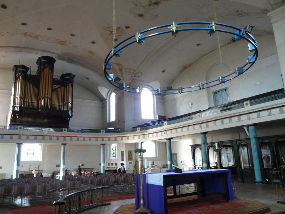 By James Spiller 1791-94, restored after fire in 1955 by N.F. Cachemaille-Day and William C. Lock. During the Covid pandemic the interior was reordered by the Holy Trinity, Brompton plant that occupies the building. This page shows the current layout in the first set of images and the 2013 layout seen on my first visit.
