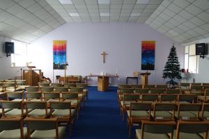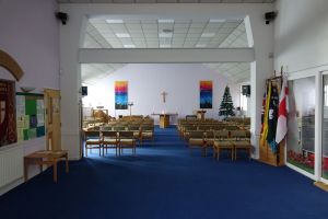 By J.J. Crowe 1952-53 with alterations in 1984-85. It stands high up at one end of the large suburban shopping centre off Hilldene Avenue.
