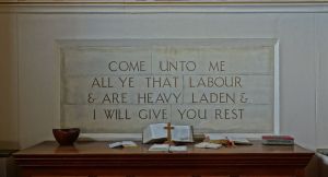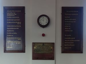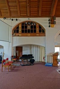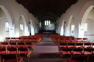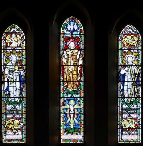 By J.J. Crowe from 1938-39. However, it has recently been added to (2009-2010) creating a substantial evangelical church centre through which the church is now entered. The church was reordered some years ago giving it a stepped nave, but recent additions are two windows in the north transept. These are actually panels mounted inside the church about 6 inches in front of the window. The east window is traditional stained glass.