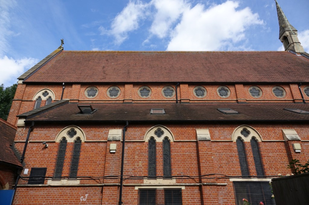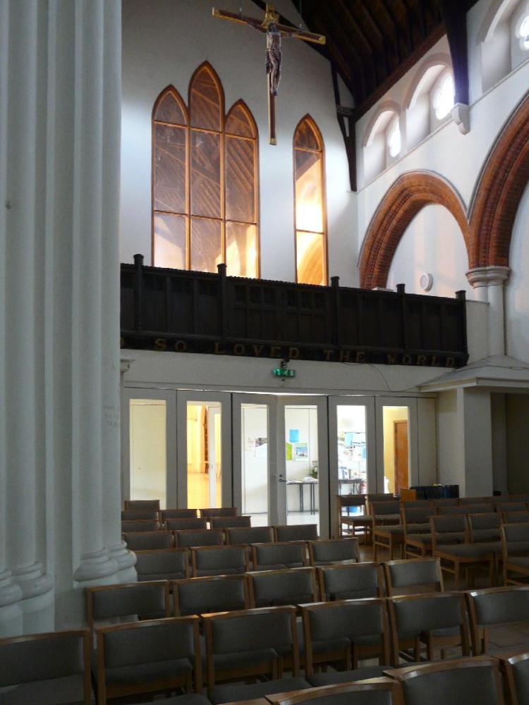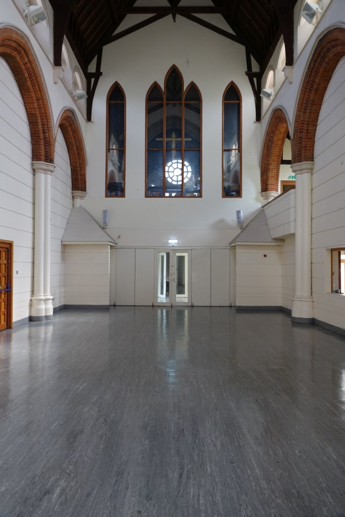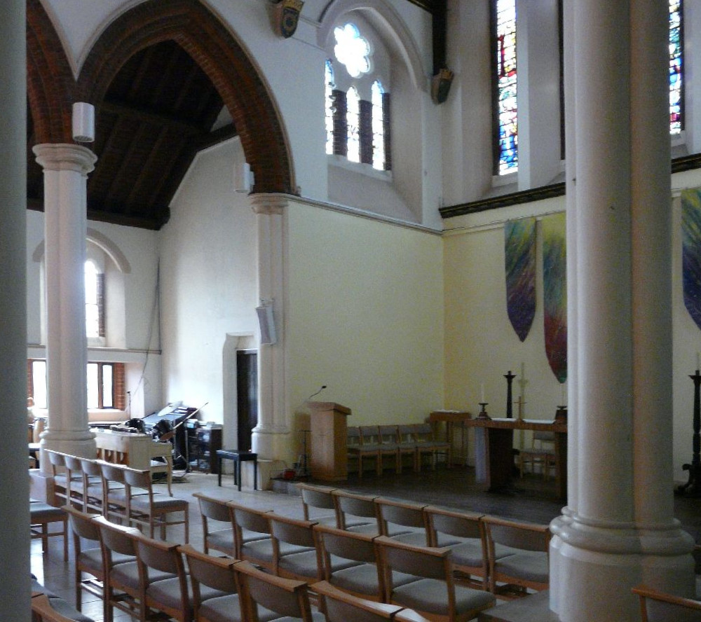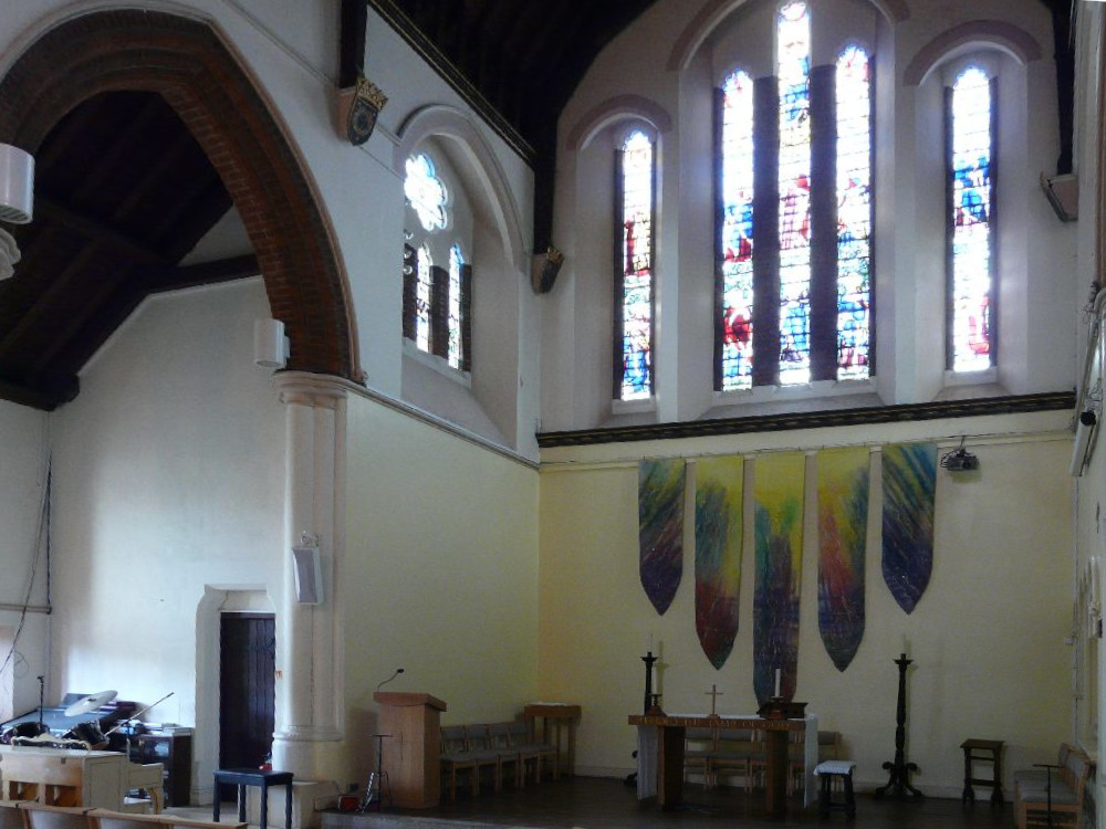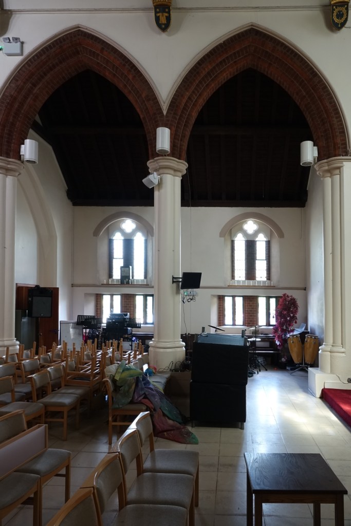 A large, now subdivided church by J.E.K Cutts and J.P. Cutts dating from 1903-07. It was part of a mission founded by Felstead School, Essex. The chancel is used for worship and the nave and aisles as a hall and associated facilities. There is glass in the sanctuary area by Ninian Comper, some other glass is hidden by inserted ceilings and by being in toilets (the gents ones are shown). In my 2024 visit the decorators were in so the interiors of the worship area were somewhat disrupted. A few from my 2013 visit are included for completeness at the end of the worship area interiors.