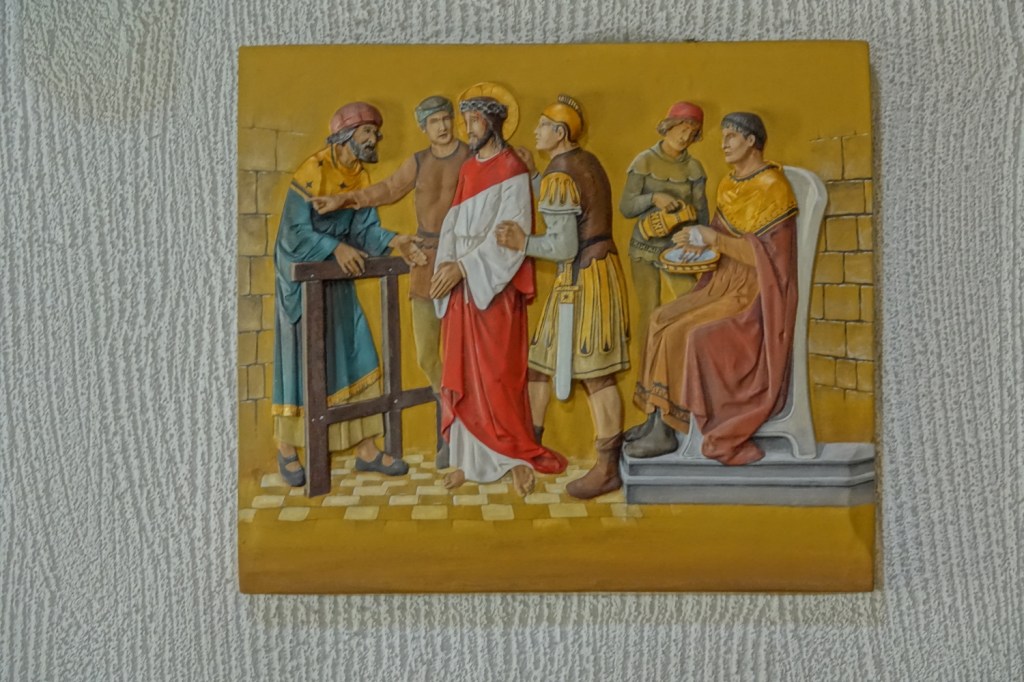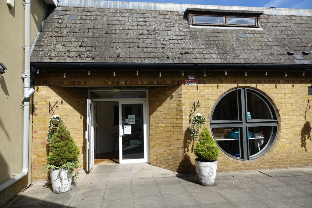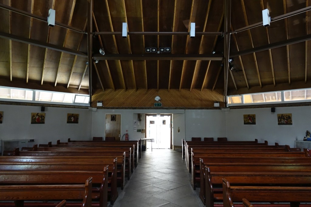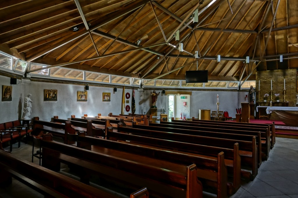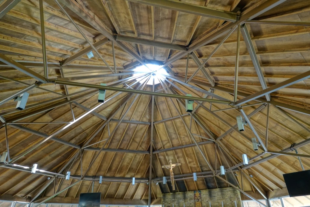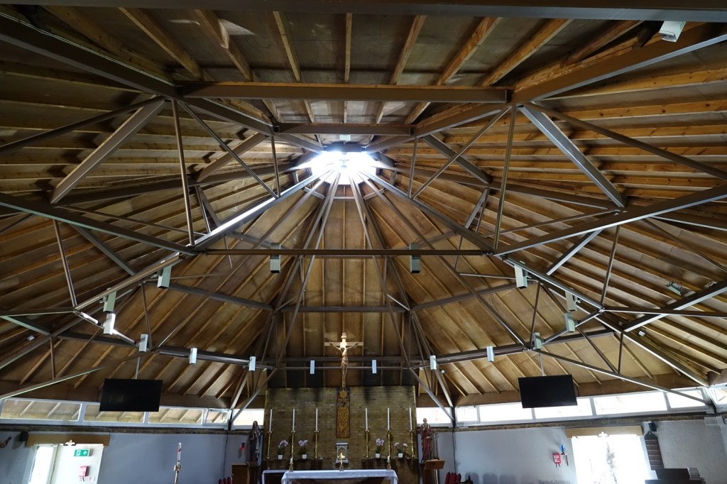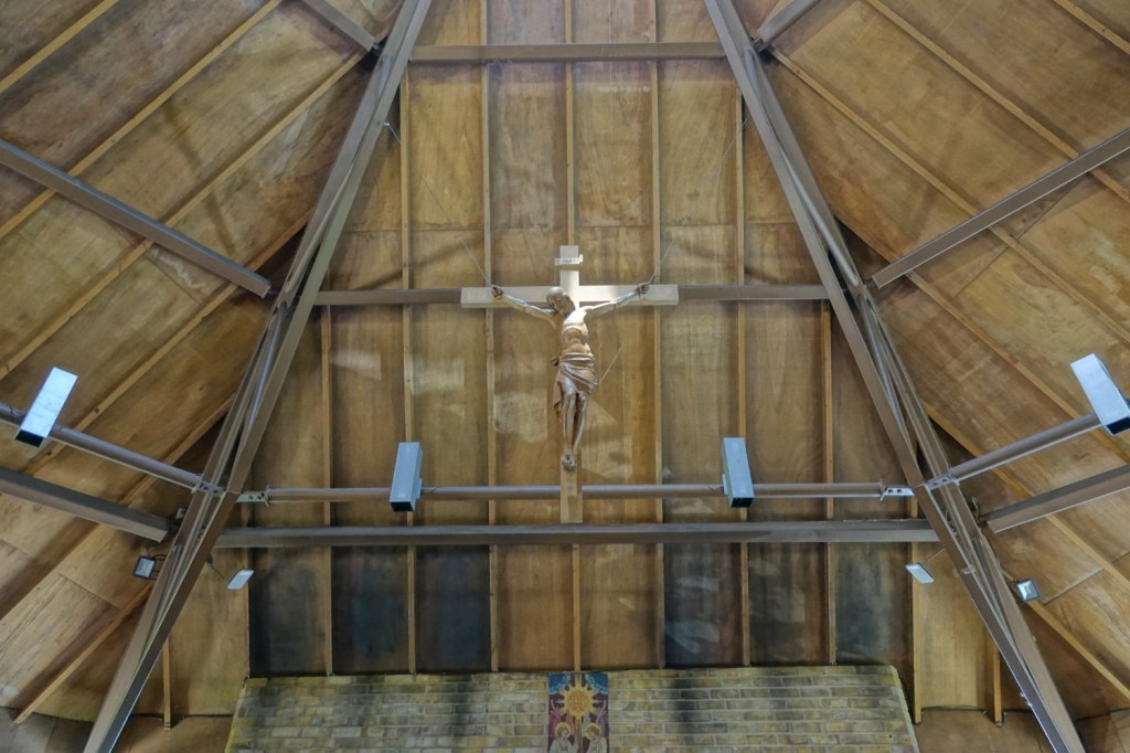 A small church of 1980-81 by Francis Weal, replacing a church damaged in the second world war, an arch from that church forms the entrance to the site.