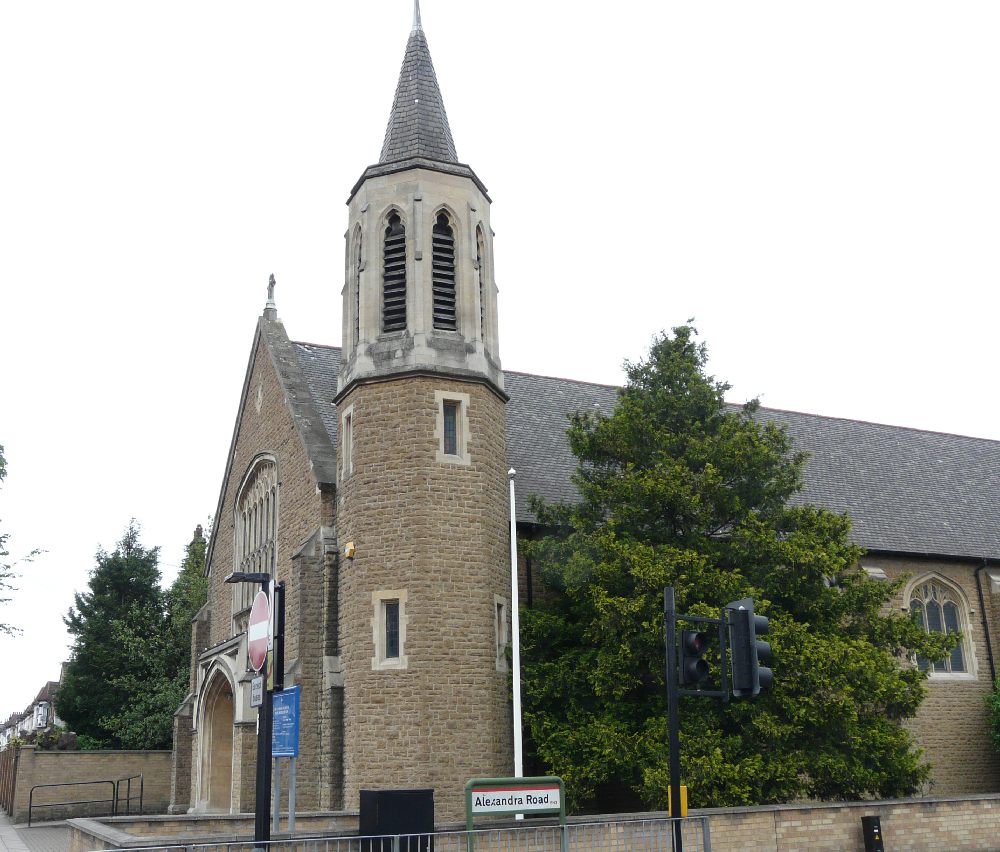 At the north end of Ponders End this is by Joseph Goldie and dates from 1921-24. Inside most of the stained glass is mid 20th century by Harman & Co.