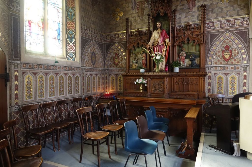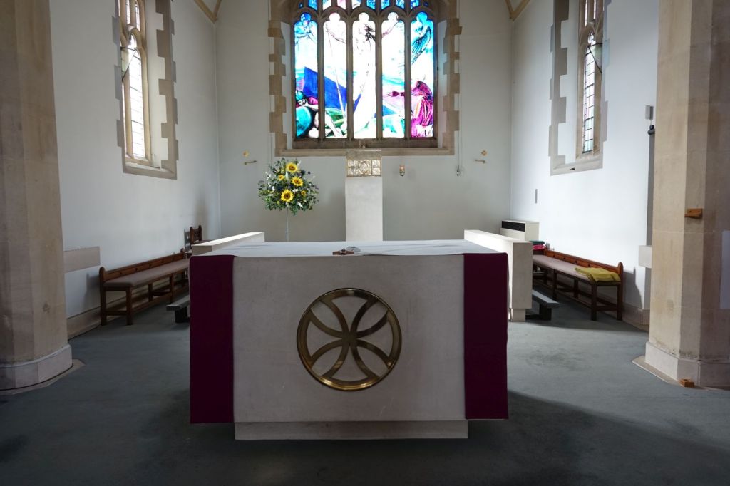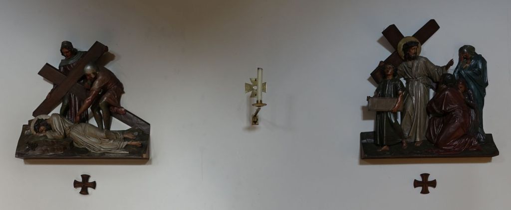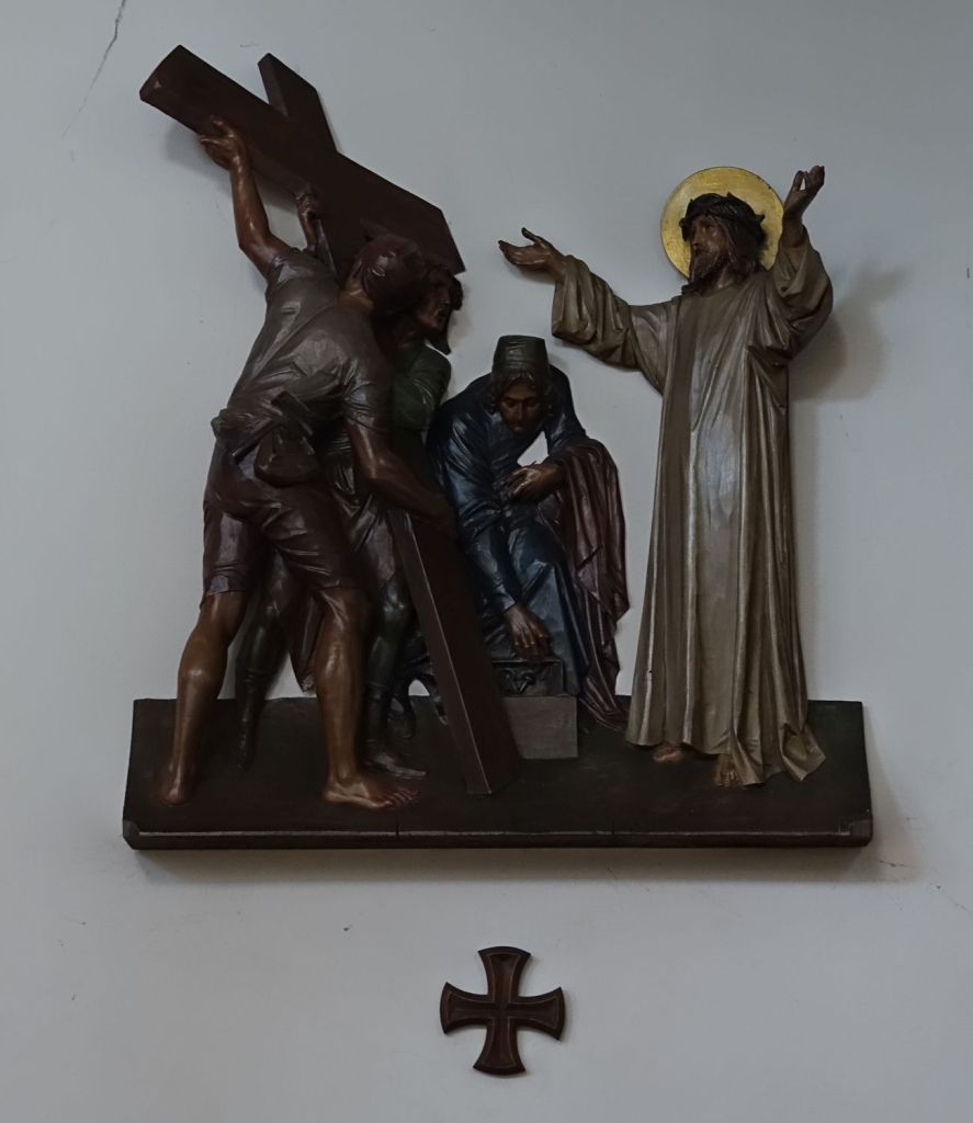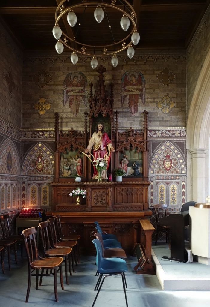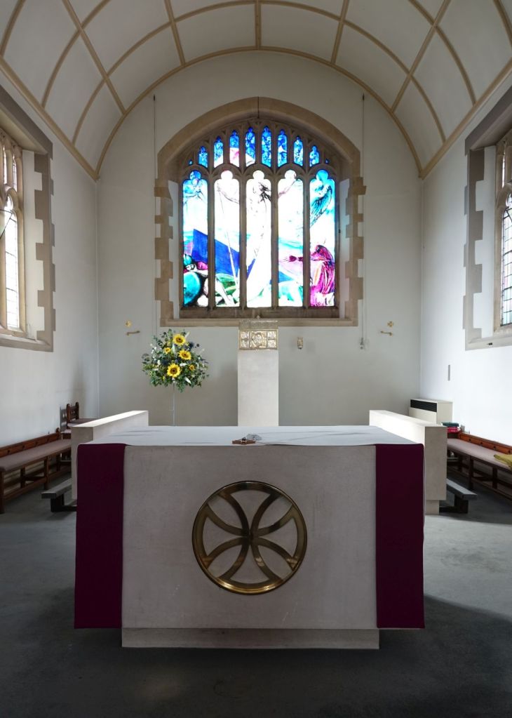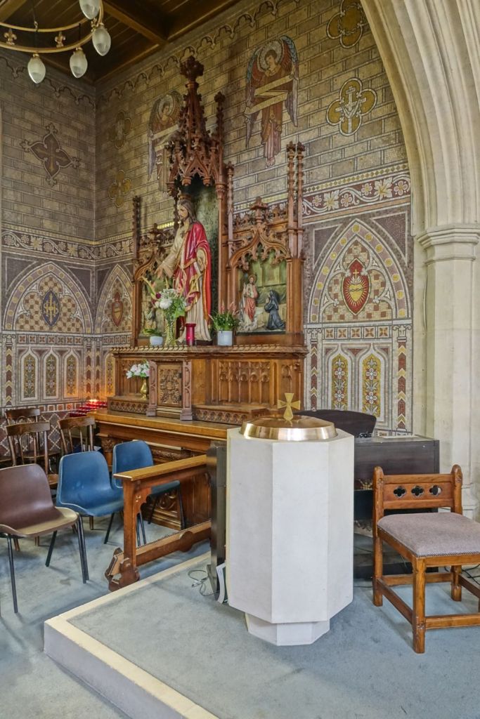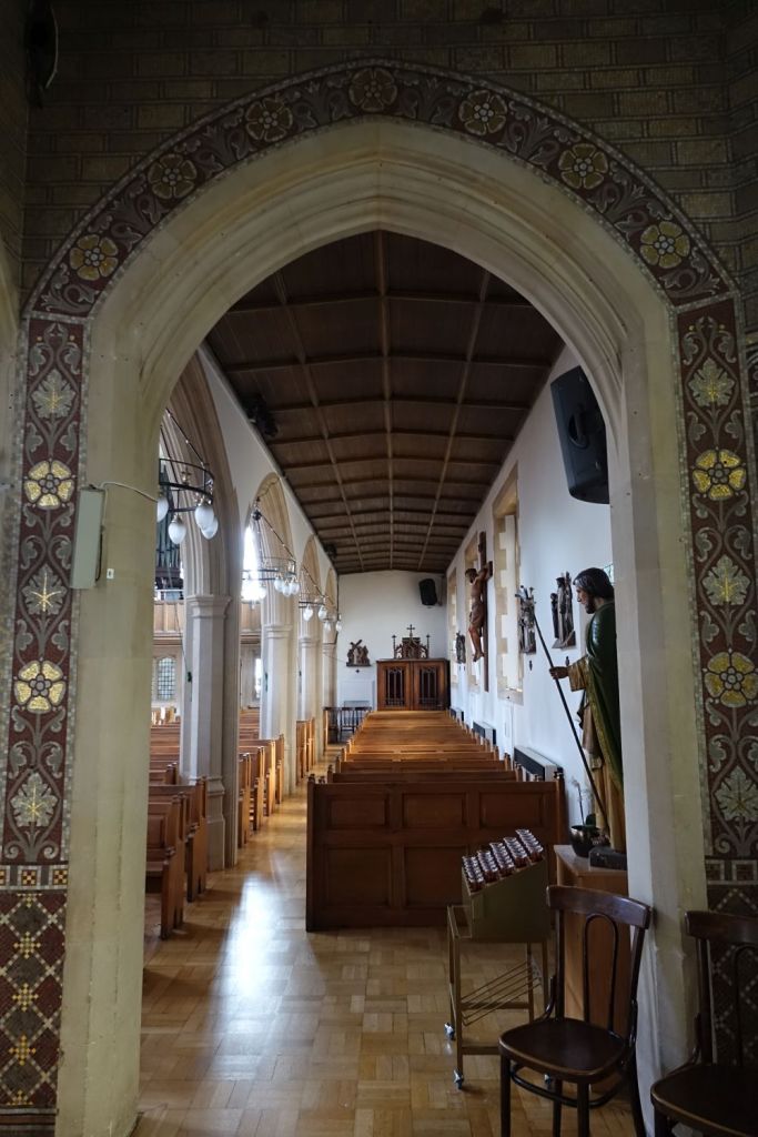 Just up the road from the Anglican parish church. It dates from 1913-14 and is by Edward Goldie. The striking east window is by Carmel Cauchi and is from 1984.