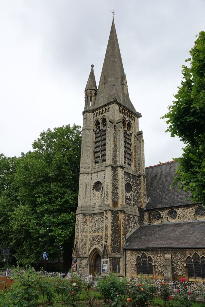 Tucked away east of the centre of Hackney. It is a work by Newman and Billing of 1872-73 with the tower and spire added in 1882. The interior has been emptied of many fittings.