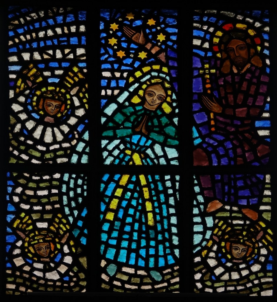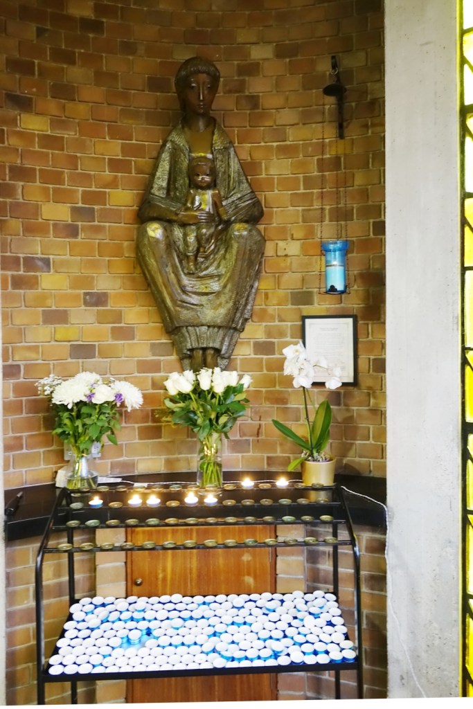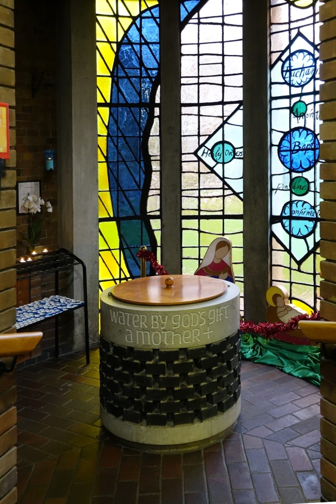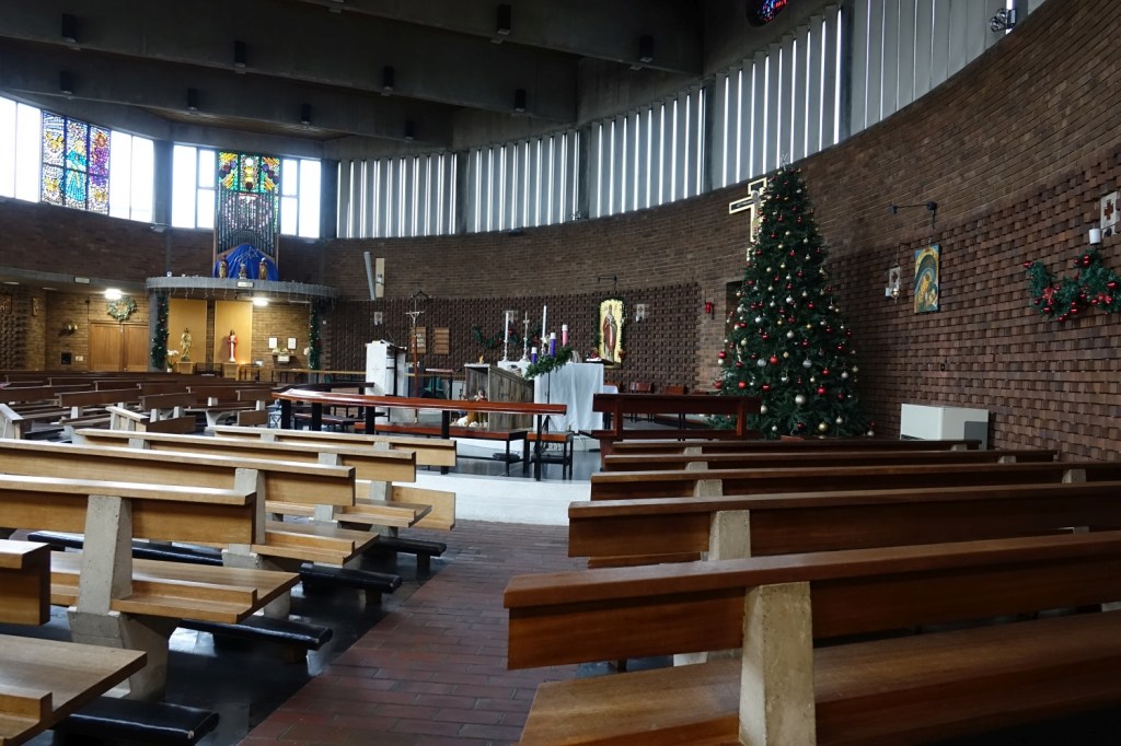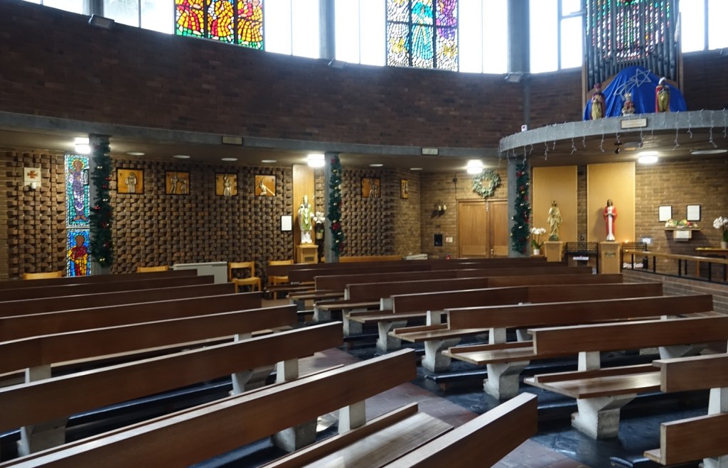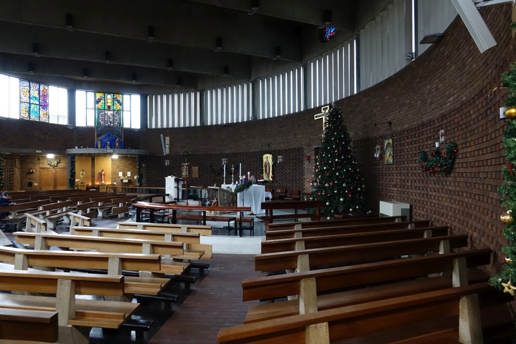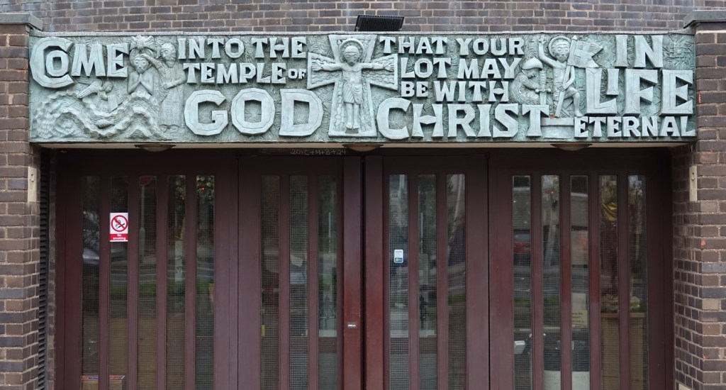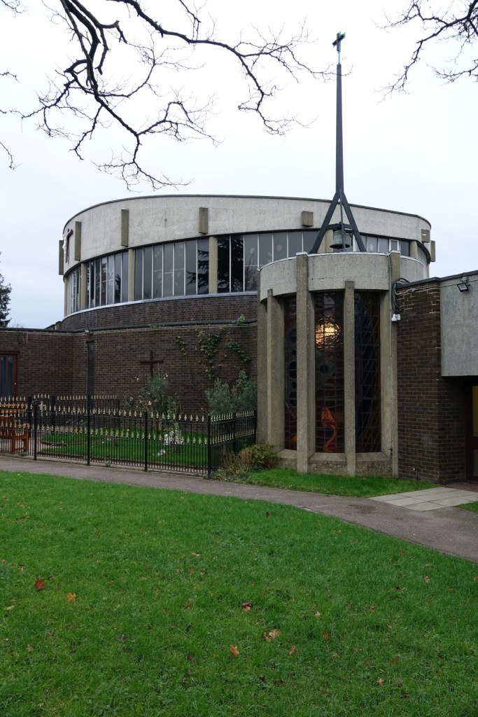 On the main road towards Ruislip, an oval church of 1965-1967 by Gerald Goalen. The baptistry glass is by Patrick Reyntiens, the other windows were added in 1987-1989 and are dalle de verre by Charles Norris.