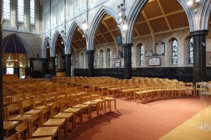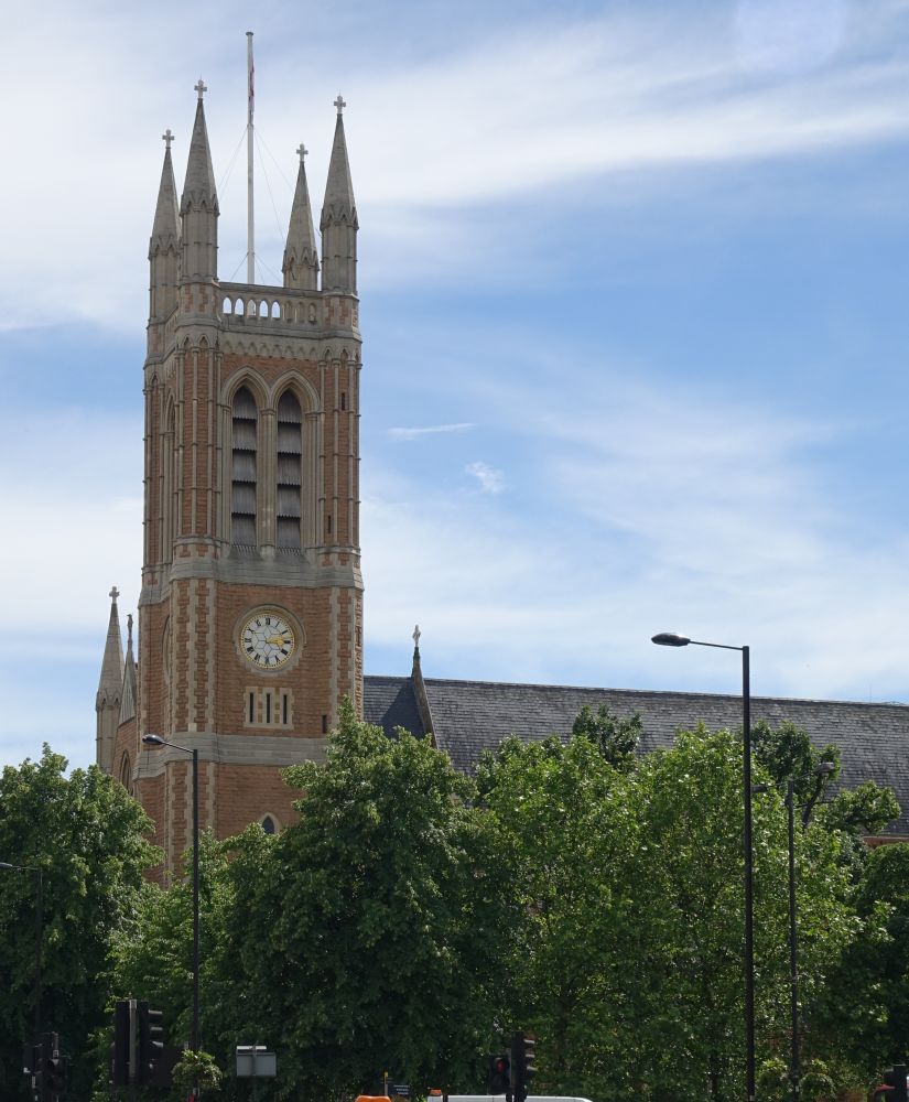 The parish church for Hammersmith town centre. It is on something approaching a traffic island on three sides, with the fourth made up of the elevated M4 passing a few feet away. It is a large church of 1882 by H. Roumieu Gough and J.P. Seddon. recent restoration has seen the addition of a large western extension with offices and a cafe and an emptying of much of the church’s furnishings in favour of a modern evangelical style.