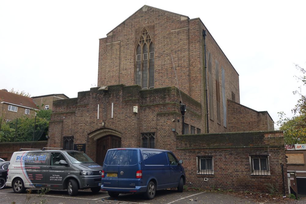 Built as a church for the deaf by Edward Maufe in 1924. It became a social club run by the Royal Association of Deaf People but was for sale in 2014. A visit in April 2018 showed that it had been bought by the Cherubim and Seraphim Church (second two images). However, the basement halls are still (November 2023) used by Clapham Deaf Sports & Social Club. The upper two images show the side of the church in November 2023.