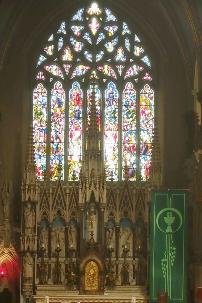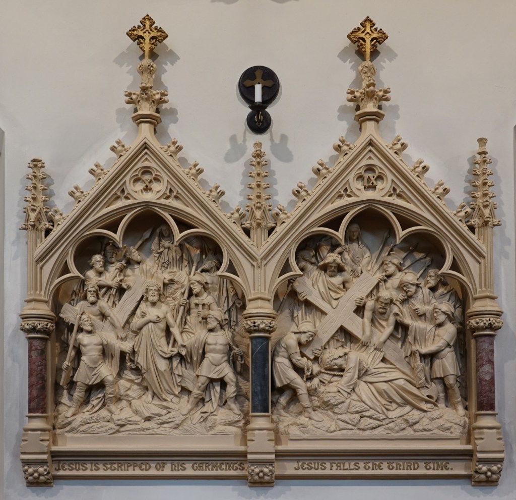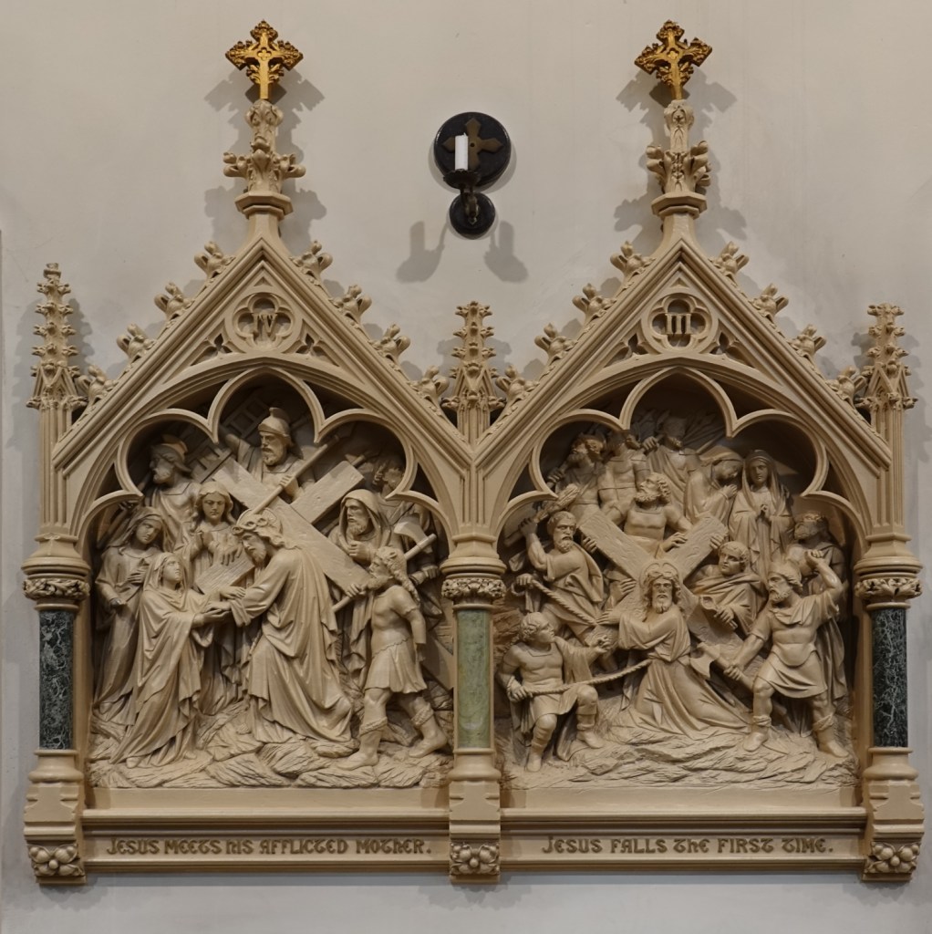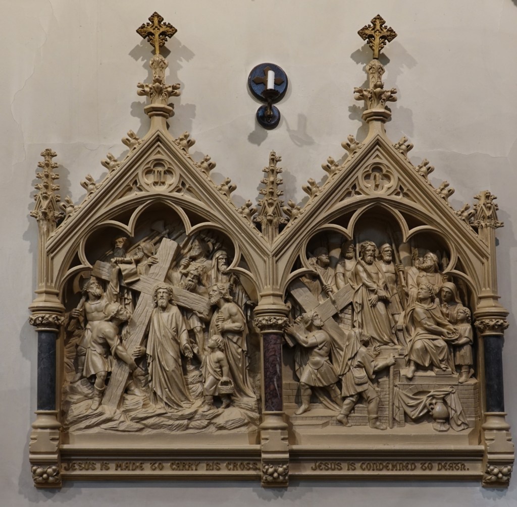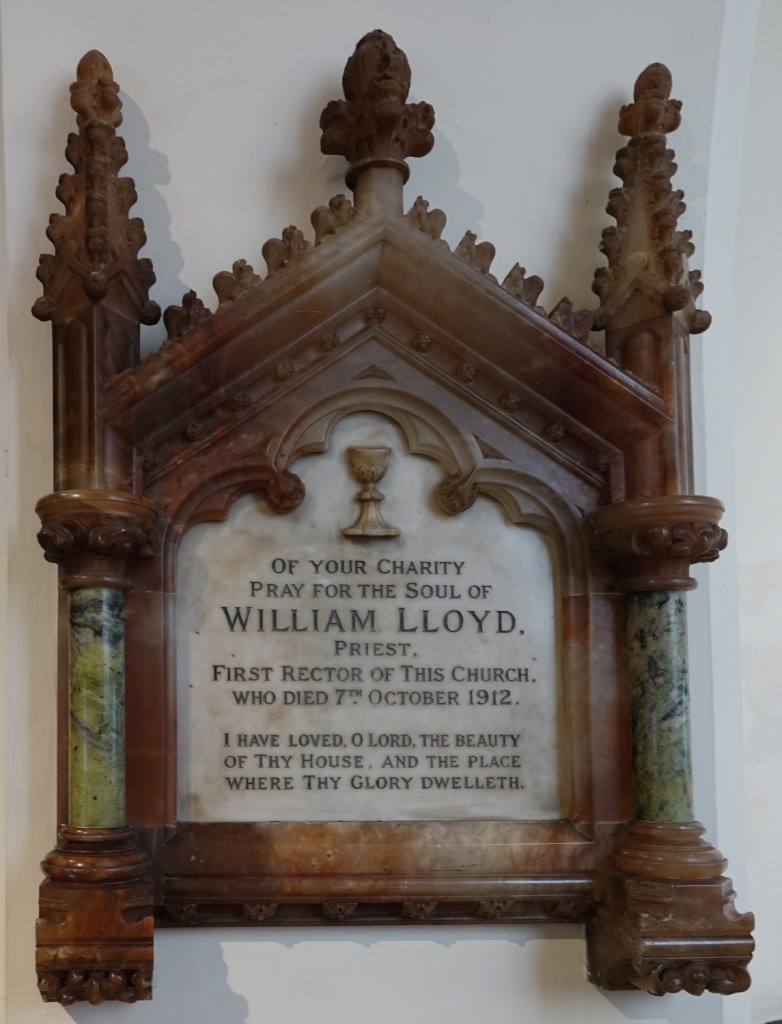 Opposite St Leonard. It was built in 1892, its architect Alfred E. Purdie. A transeptal chapel was added in 1962-65 and designed by Thomas Sibthorp. Virtually all of the glass is by Harman & Co, that in the chapel relocated from the clerestory.