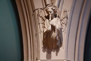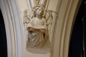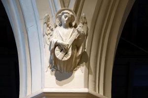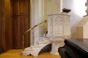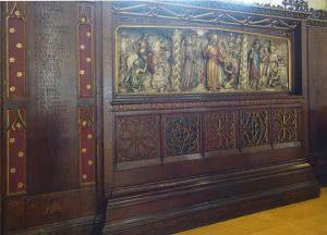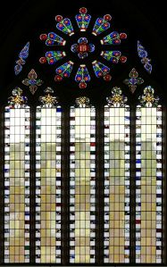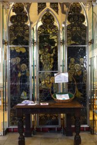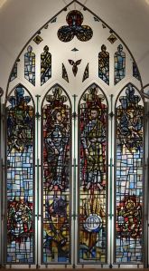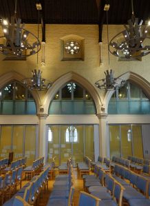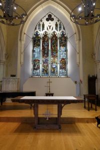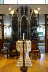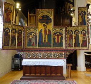 Halfway between Kensington and Earl’s Court. Designed by T. Johnson and built in 1857-58. In 1863 the south aisle was widened and a south transept added. The interior has been much divided leaving a smaller worship area in the nave and north aisle. The reredos now in the north aisle is by Walter Tapper. The pulpit has been moved back behind the altar and the east and west window glass are displayed against lightboxes.