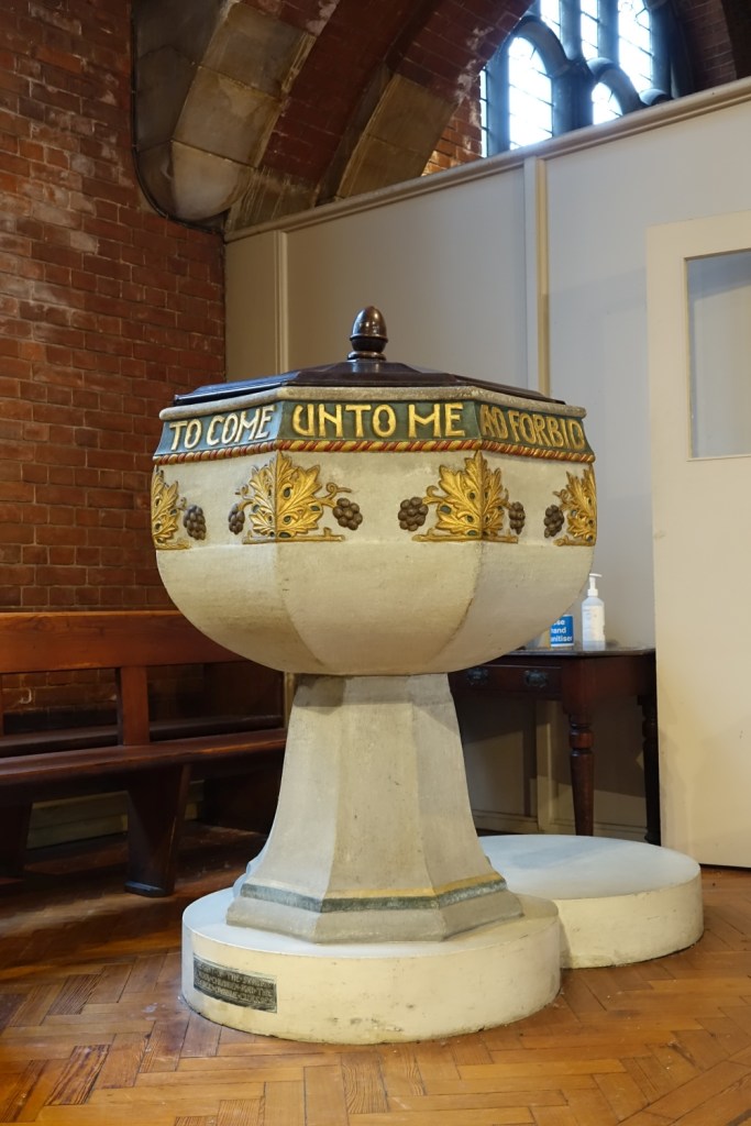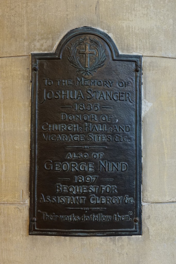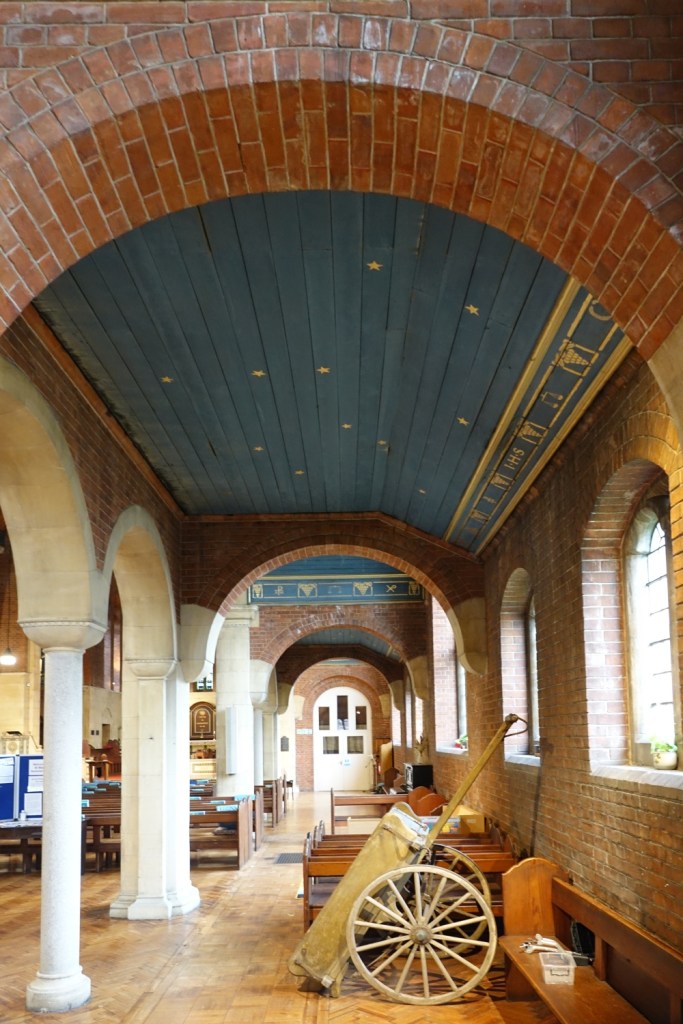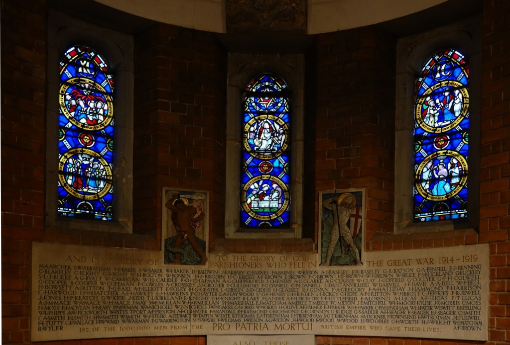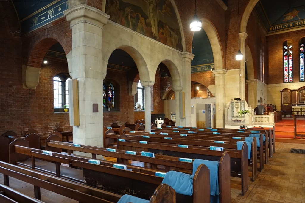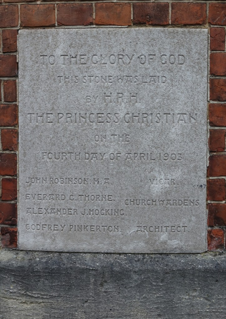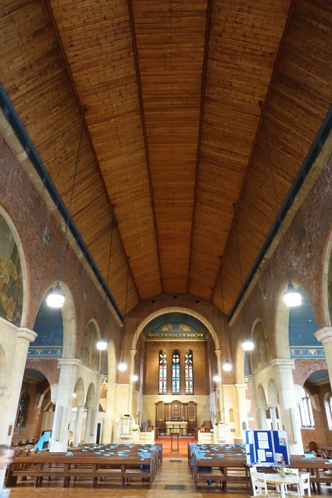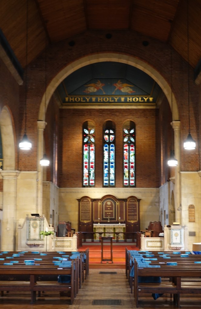 In a large area of grounds, it is by G. Pinkerton, dating from 1903-04. The interior is byzantine rather than gothic with some of the nave aisles barrel vaulted. There is an abundance of painted decoration on the ceilings and four large wall paintings. It retains an early 20th-century evangelical sanctuary arrangement. The western baptistry has been converted into a war memorial. The east window is late Morris & Co glass.