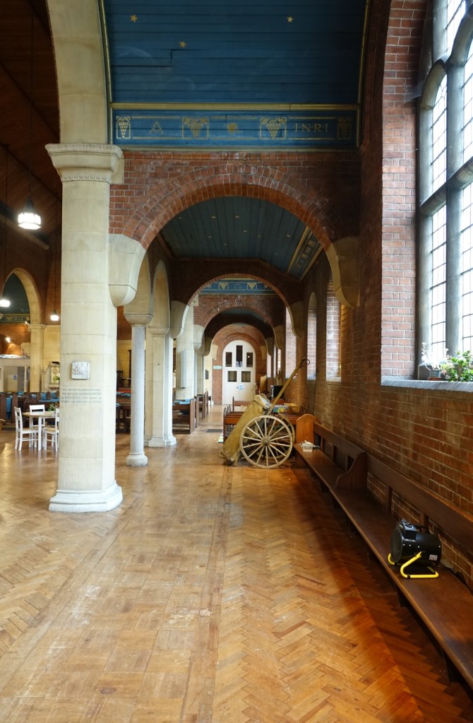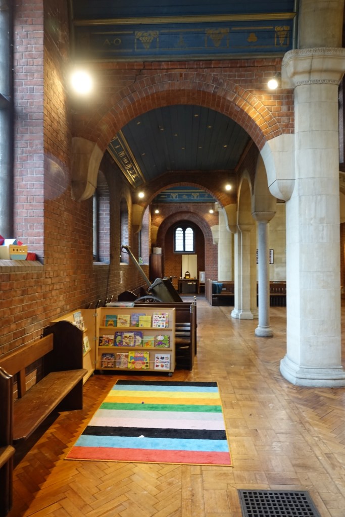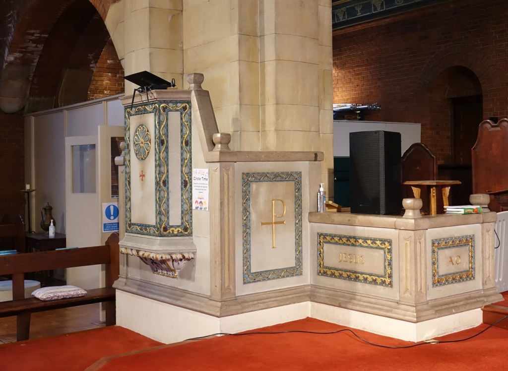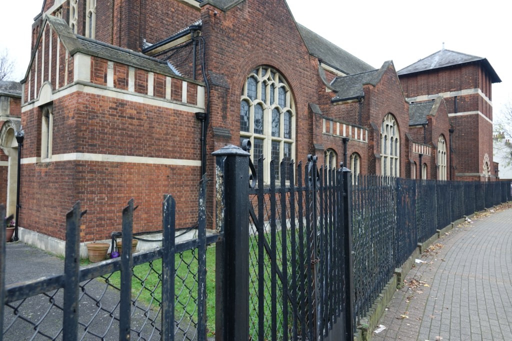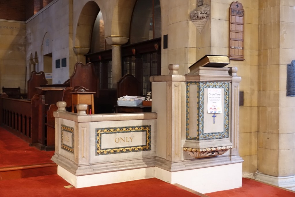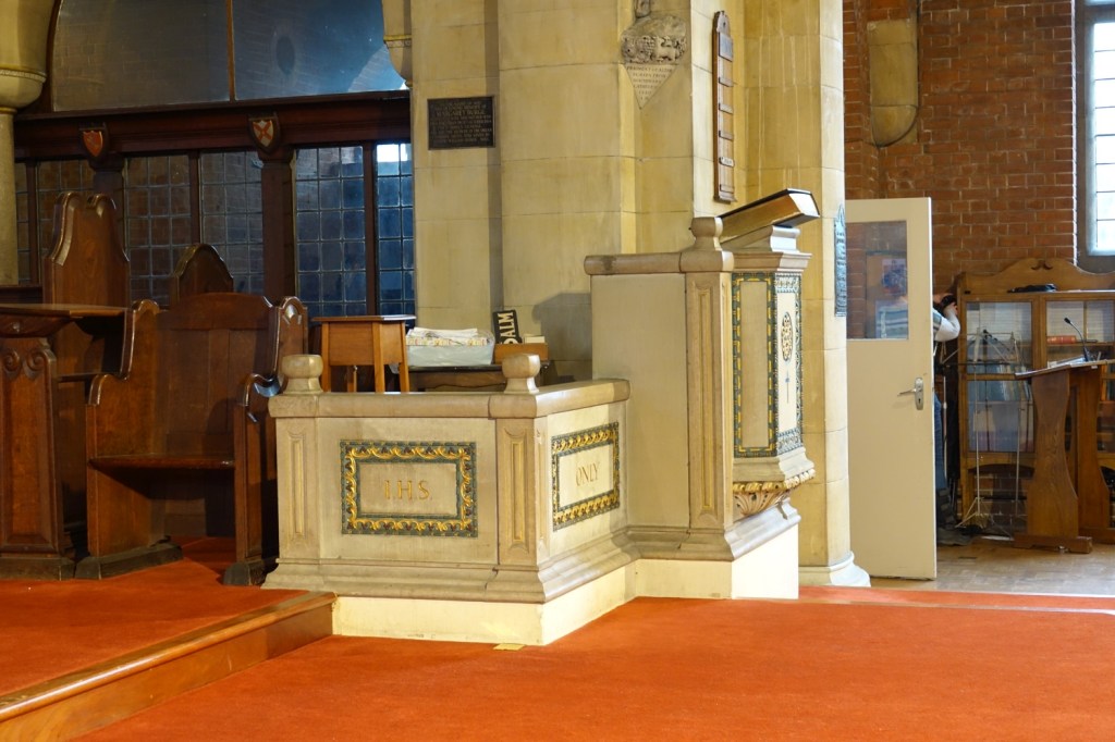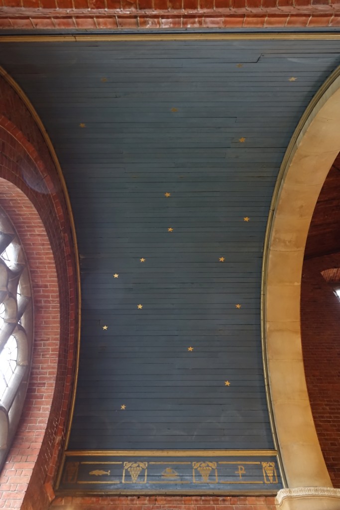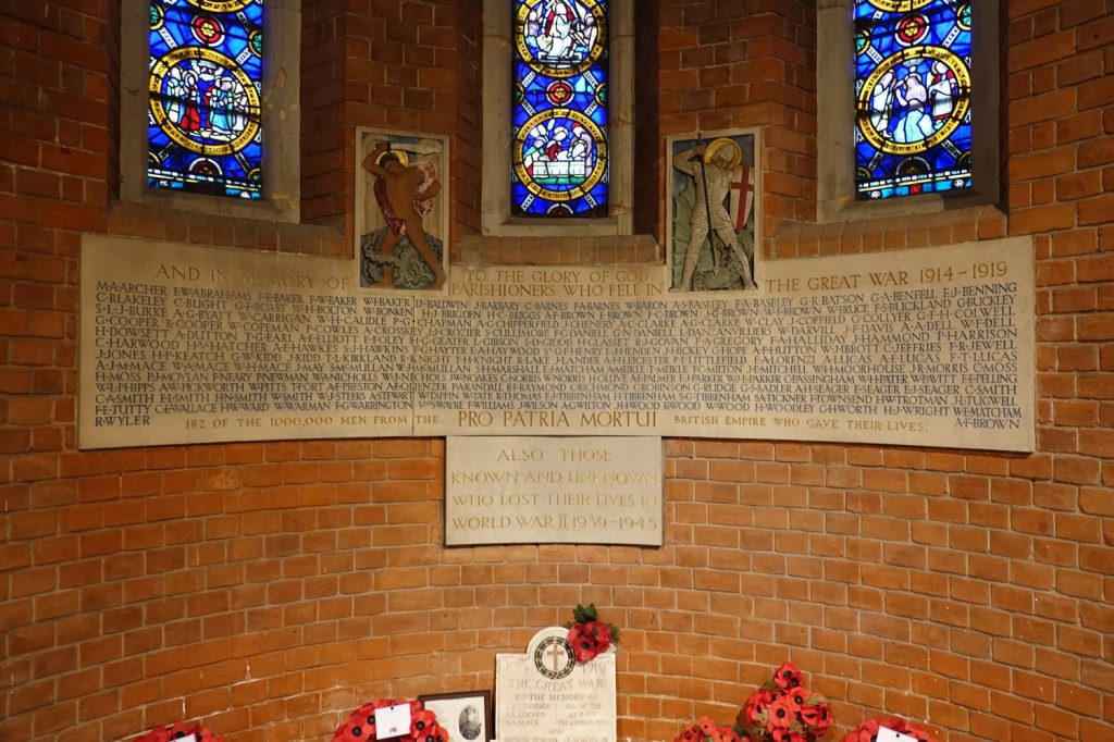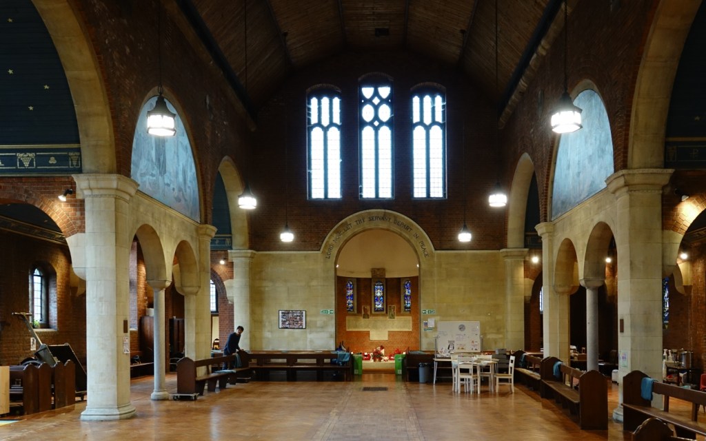 In a large area of grounds, it is by G. Pinkerton, dating from 1903-04. The interior is byzantine rather than gothic with some of the nave aisles barrel vaulted. There is an abundance of painted decoration on the ceilings and four large wall paintings. It retains an early 20th-century evangelical sanctuary arrangement. The western baptistry has been converted into a war memorial. The east window is late Morris & Co glass.