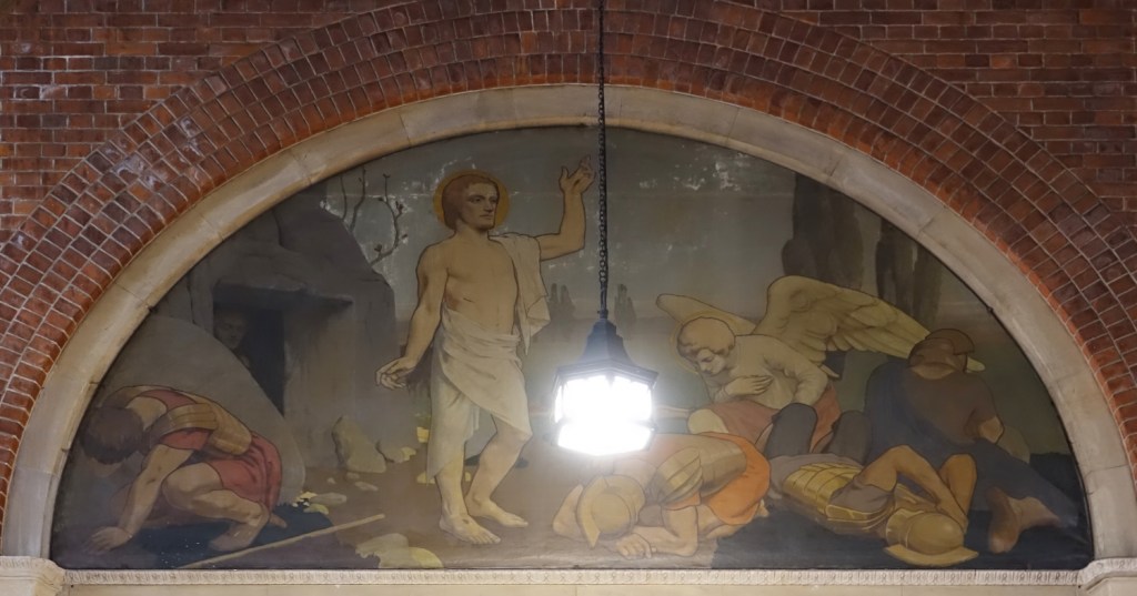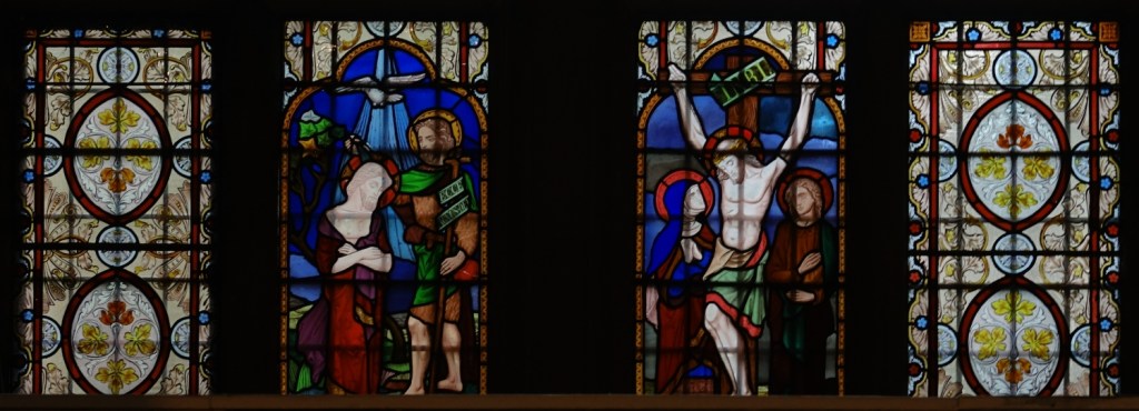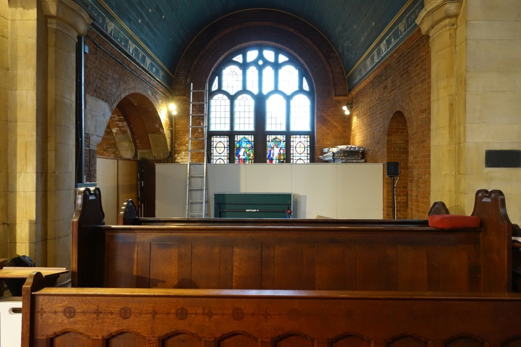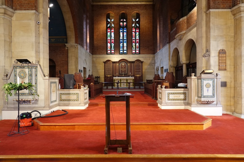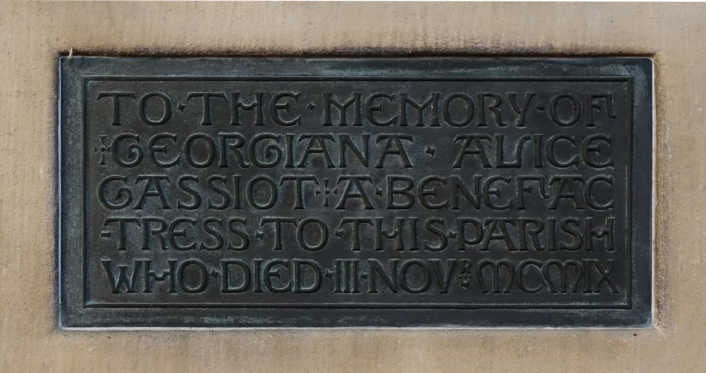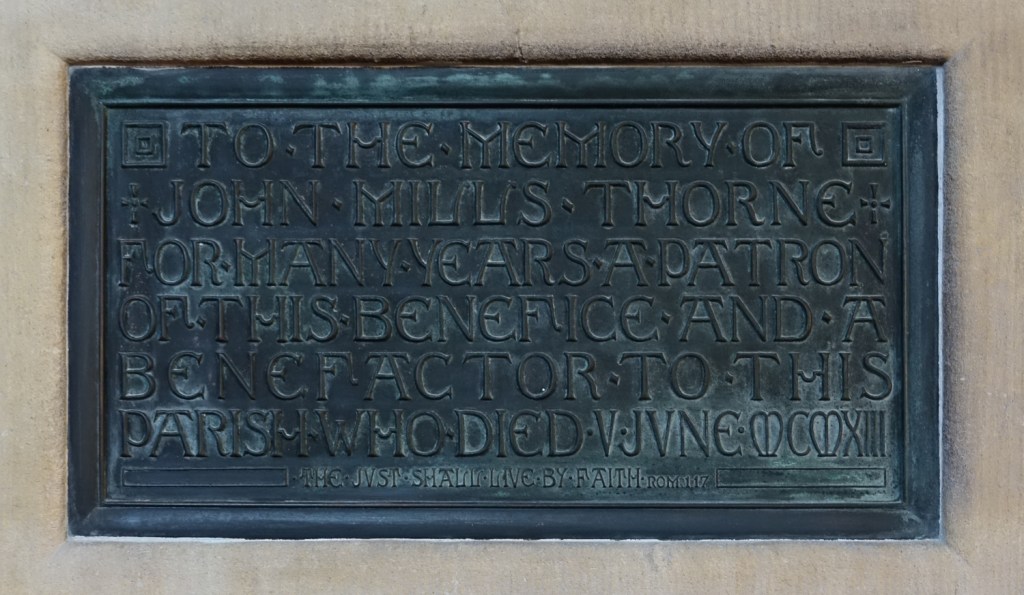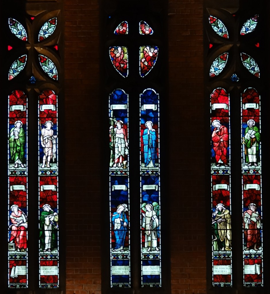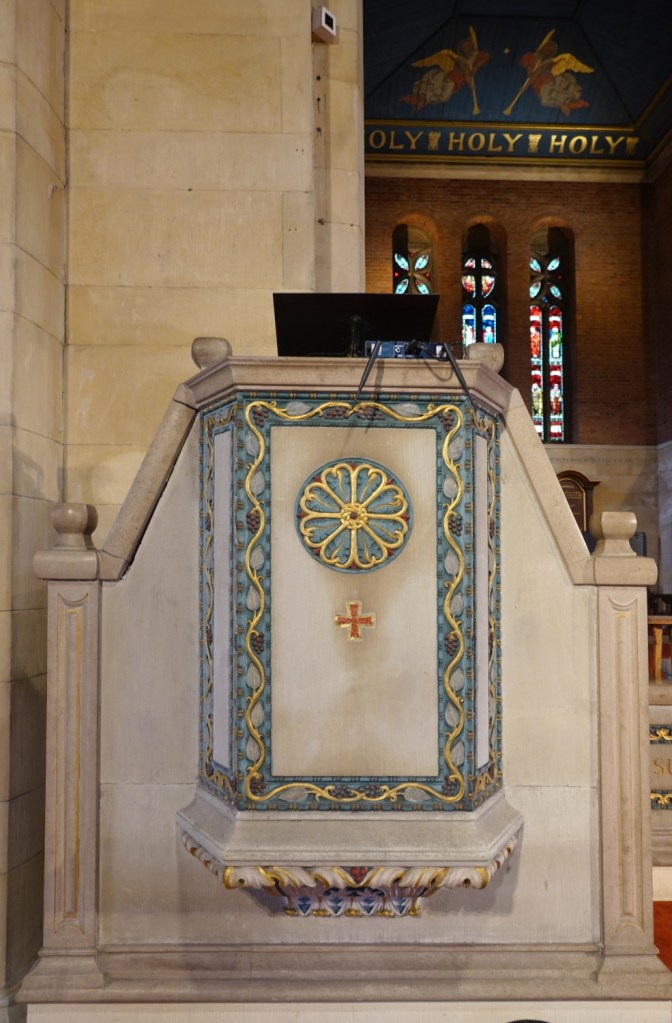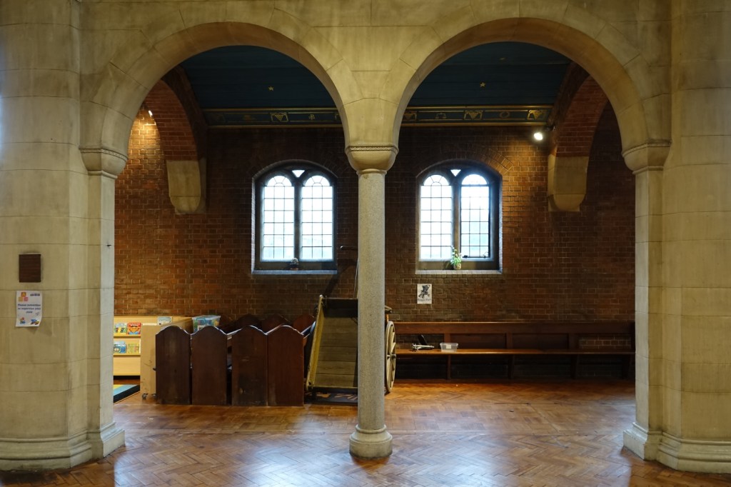 In a large area of grounds, it is by G. Pinkerton, dating from 1903-04. The interior is byzantine rather than gothic with some of the nave aisles barrel vaulted. There is an abundance of painted decoration on the ceilings and four large wall paintings. It retains an early 20th-century evangelical sanctuary arrangement. The western baptistry has been converted into a war memorial. The east window is late Morris & Co glass.
