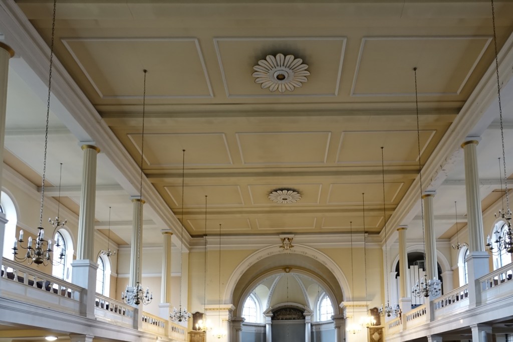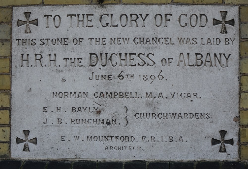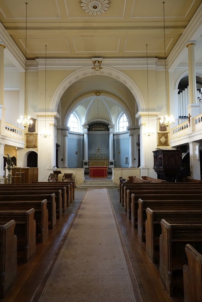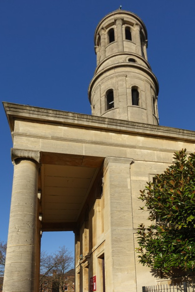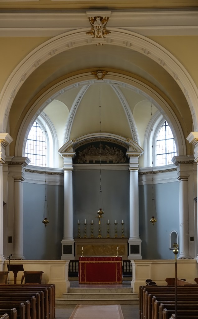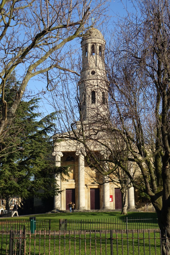 The very tall tower can be seen from some way off. It dates from 1820-24 and is by Robert Smirke. It sits on a slope at the top of a large green space. The chancel was added in 1896 by E.W. Mountford, there was also work by William White in 1891.