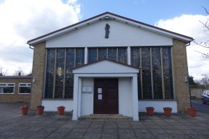 South of the village centre. It was built as Rosary Hall in 1954 and upgraded to a church in 1956, the architect is unknown. The coloured glass and porch in the main front have since been added.
