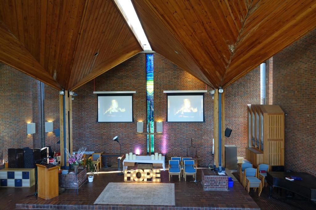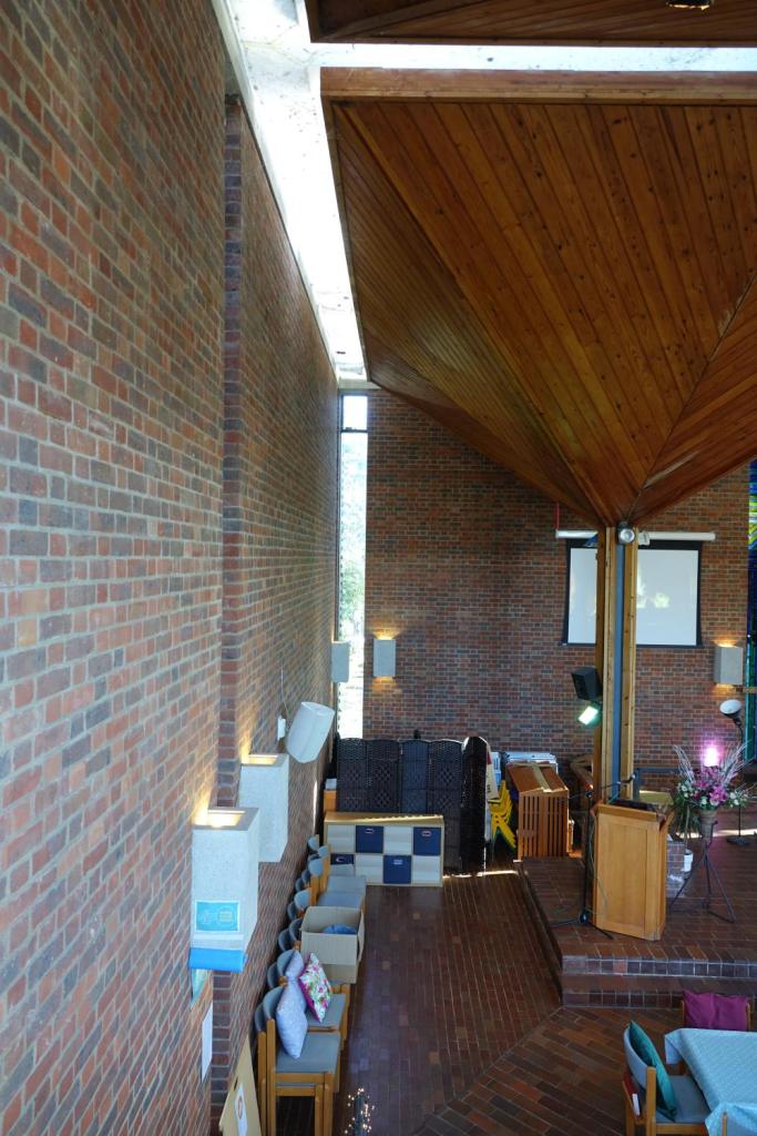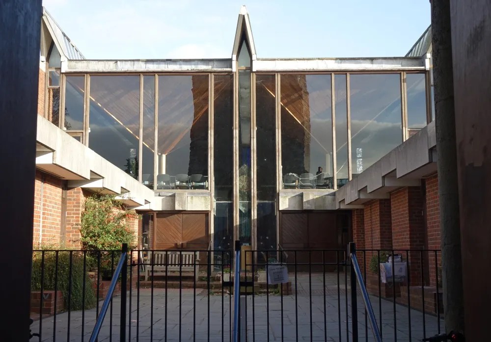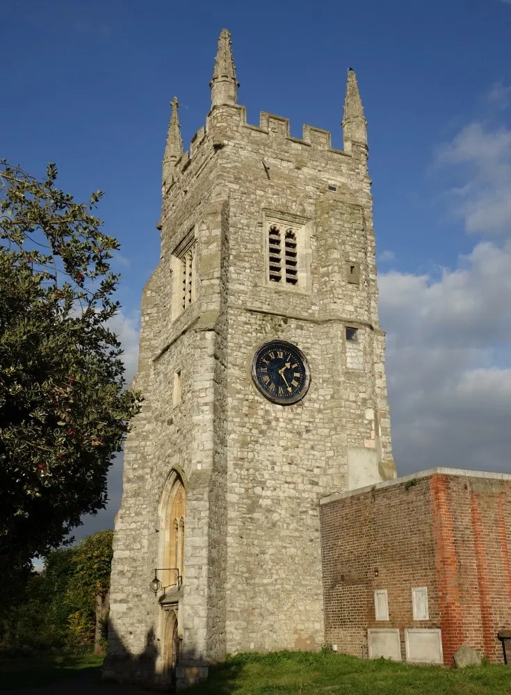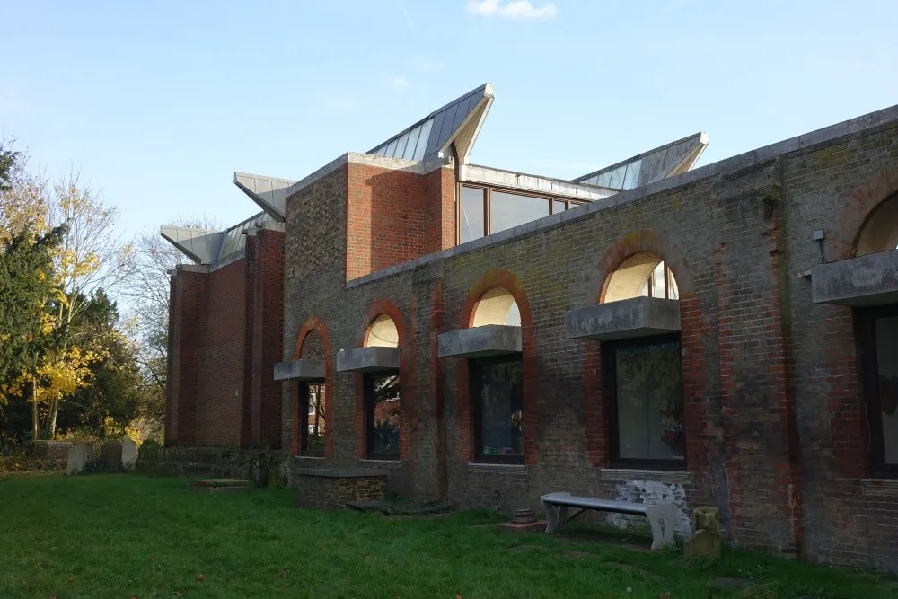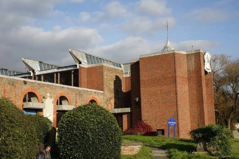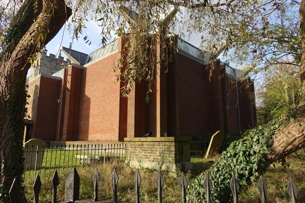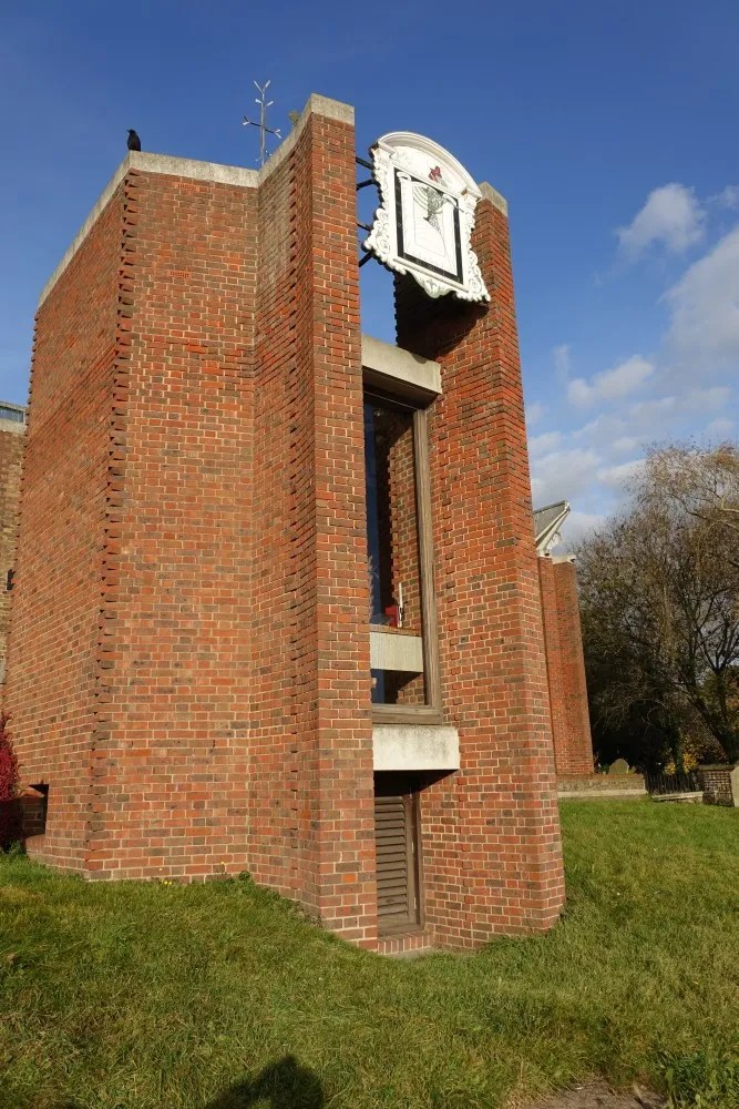 The old village parish church right by the River Thames. However only the 15th century tower and 1706 nave outer wall remain as the church was seriously damaged in arson attack in 1943. The church of 1967-70 by Michael Blee sits where the old chancel was, the nave being a courtyard with the aisle spaces filled with small rooms. There is a small Joshua chapel just inside the church (used as buggy store on my visit)