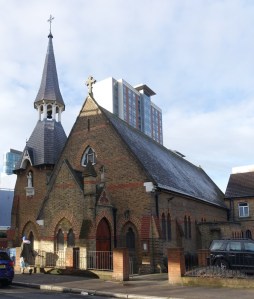 In the north of Brentford, almost under the M4. It is a small church of 1866 by J.T. Jackman.