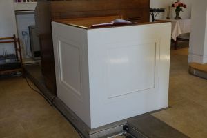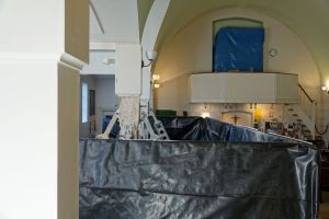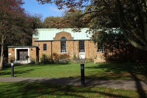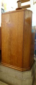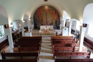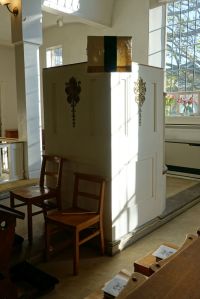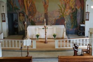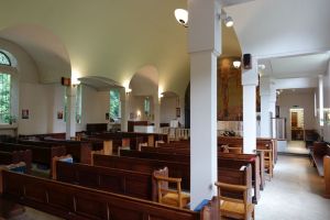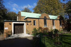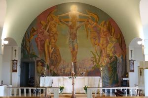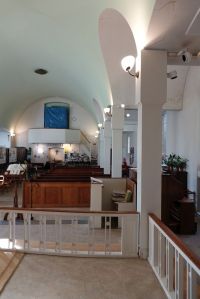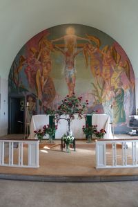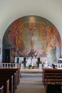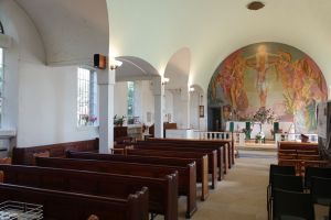 At the eastern end of Rotherhithe near the City Farm. It is a replacement for a war-damaged early 19th-century building. It dates from 1960 and is by Thomas F. Ford. The east end features a mural of the risen Christ by Hans Feibusch. My visit in mid-November coincided with remedial work on some of the concrete pillars so part of the church was screened off, the organ encased and the Lady Chapel used as a furniture store, Views from May2019 show the building in its true state.