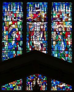 The tower and part of the west front of J Fowler’s war-damaged 1876 church front the street, behind which stands the current church of 1957-58 by A. Llewellyn-Smith.