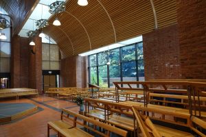 Visible across the Alleyn’s School playing fields, this is a large church of 1995 by L. Malcic of HOK . It replaced a previous church of 1892-1895 destroyed by fire in 1992. All that remains is a small section of wall in the associated hall and office area and the font. The spire is transparent and sits in the centre of the roof over the centrally placed altar. The interior is tall and light with intricate glass by Caroline Swash and a large modern organ. There is also a side chapel near the entrance from the foyer area.