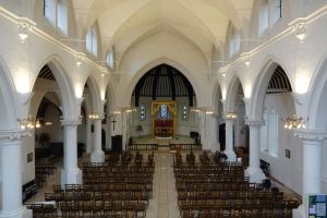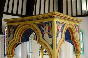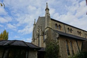 Facing Goose Green north of East Dulwich Road. The church was built in 1863-65 by Charles Bailey but was badly damaged in WW2 and reconstructed and refurnished by Sebastian Comper in 1951. He added a clerestory and concrete vault and furnishings in his father’s tradition.