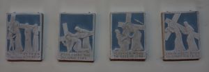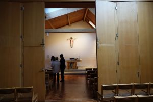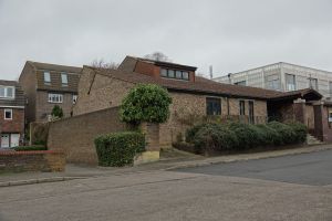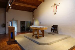 This building of 1982 by Nigel Melhuish replaces a previous church of 1864-1867. The worship area is extendable into a hall and an intermediate space between them. The calvary and war memorial triptych are from the previous building.