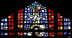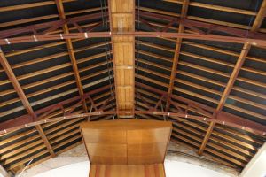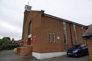 At the northern end of the estate in a suburban road, this is a church of 1962 by Tomei & Maxwell. The ceiling has recently been removed to reveal the roof structure.