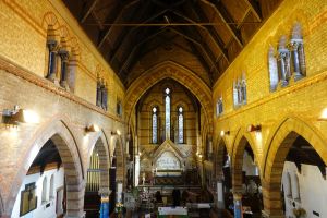 In the midst of Victorian housing north of the town centre. It was designed by A.R. Mullins and built 1867, with some additions in 1880, The western end has been divided off at ground floor level to form a hall with a large balcony area above looking into the nave.