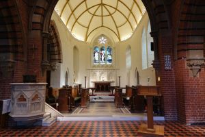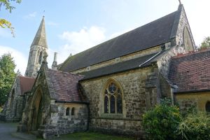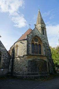 Up a steep private road near Kenley Station. This is a church of 1870-72 by James Fowler. The nave was extended a bay westwards in 1897 and a baptistry added in 1902.