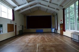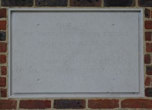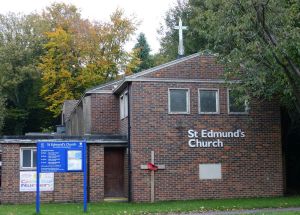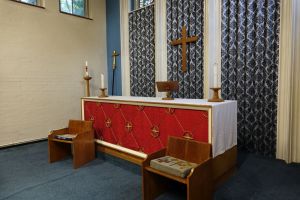A small church of 1955 in a dip. It was designed by Laings alongside nearby housing. It is a hall church with the chancel able to be screened off from the hall area (as shown below).