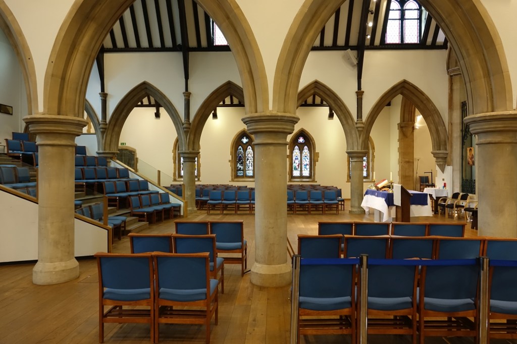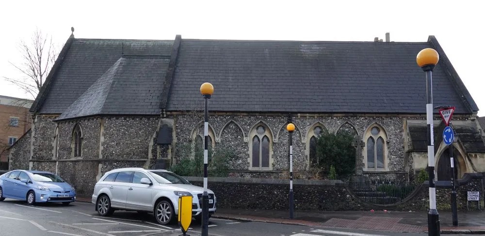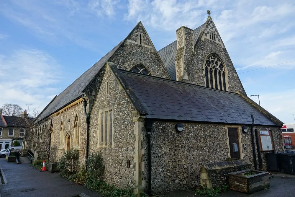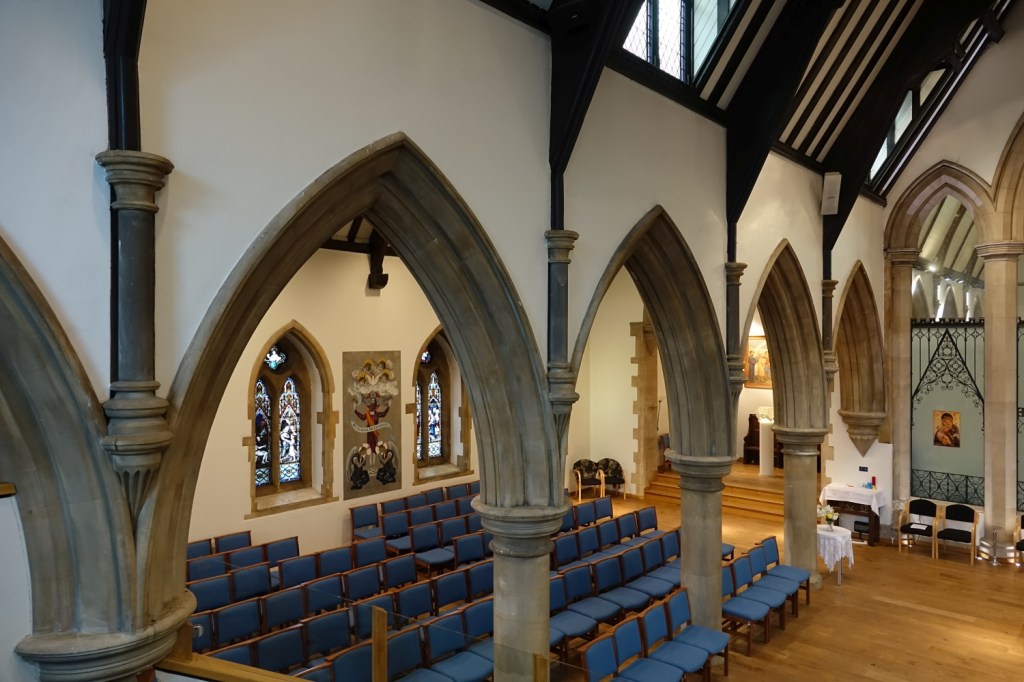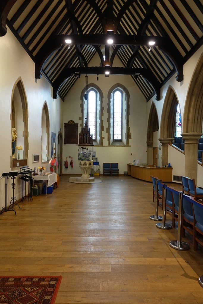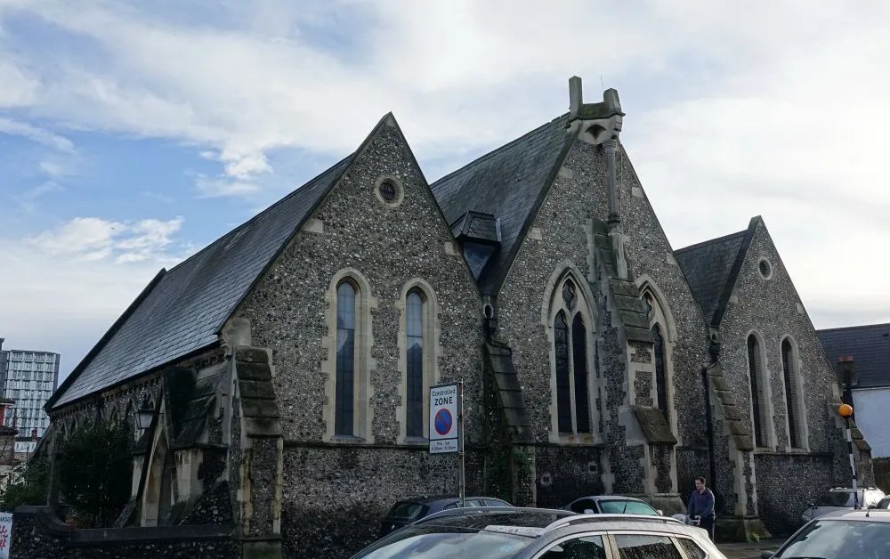 South of the town centre, this is a church designed by Benjamin Ferrey in 1857 and extended several times. Inside the west end of the nave has been stepped and filled with tiered seating. The chancel is screened off as a hall area and the east end of the south aisle is now a lounge area. There are several Ninian Comper windows.