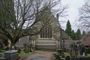 Set in a large churchyard in this prosperous suburb. The church is by G.G. Scott and dates from 1854-1856. The memorial chapel on the south side of the chancel was added in 1956 by Caroe and Partners. There are several large post-WW2 windows by Hugh Easton.