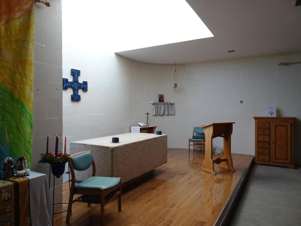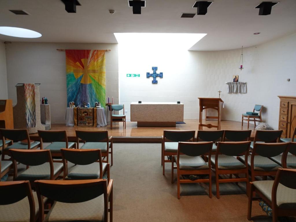 A small multi-faith room where the sanctuary area can be curtained off from the body of the chapel. The hospital was a PFI initiative and built by Taylor Woodrow between 1998 and 2003.