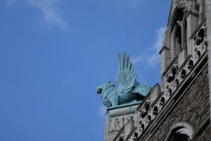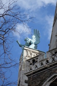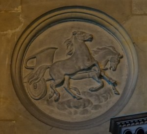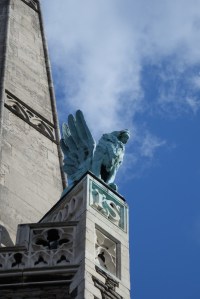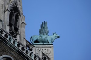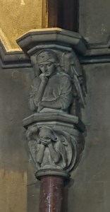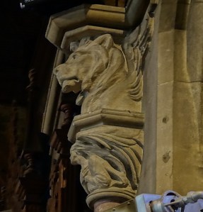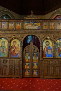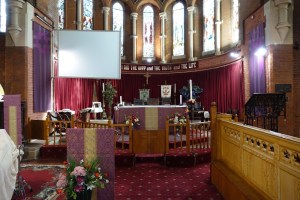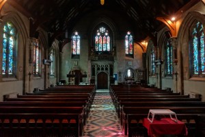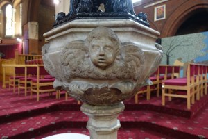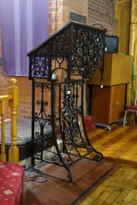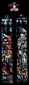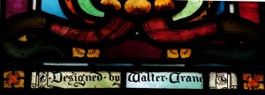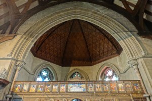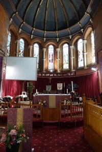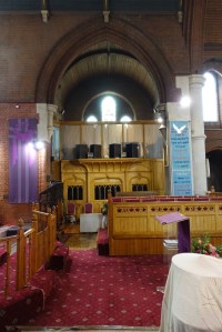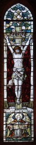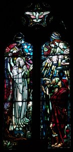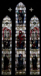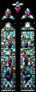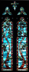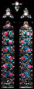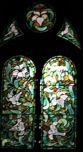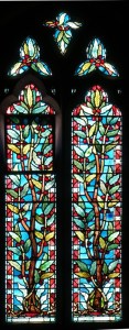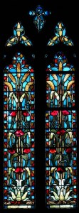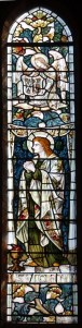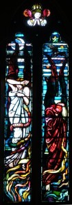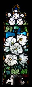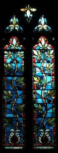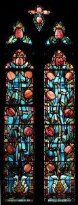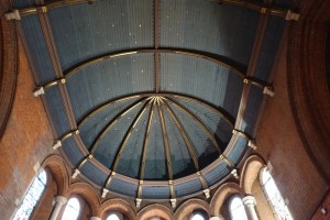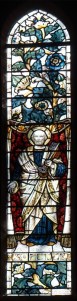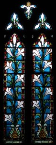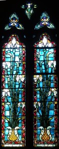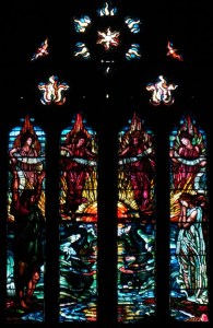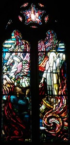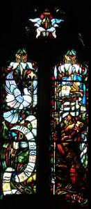 Near Finsbury Park, a semi-circular “flying saucer” design by Tom Hornsby dating from 1995. It replaced a 19th century church on the same site. The saints are reset glass from the former church, the other windows showing the Apocalyptic Visions of St. John are by Meg Lawrence from 1996 (apologies for one being a bit out of focus).
