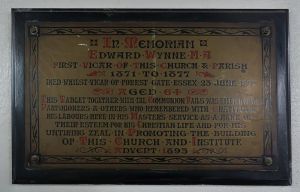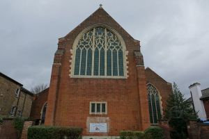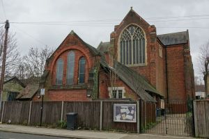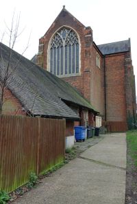 A large church of 1878-1879 by H. Elliott. Inside the sanctuary is being used as a storage area and is curtained off from the current altar platform. The 3 single light windows in the side chapel are the final work of Wilhelmina Geddes, dating from 1951, the apse windows are by William Morris (no relation) of Westminster from 1954, all replacing older glass blown out in the war. A cartoon of the original apse windows is on show in the church. The one complete pre-war window is by Heaton, Butler & Bayne.