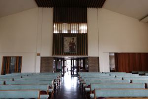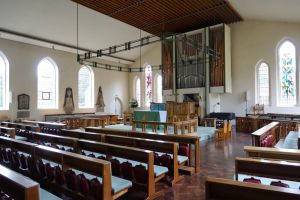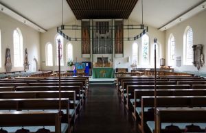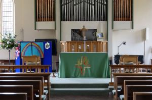 From the street, one sees the east end of a church which was added in 1888-89 by W.O. Milne to a church by Charles Bacon from 1817. However, a fire in 1969 reduced the church to the tower and a shell. It was rebuilt in 1971-72 to designs by John Phillips to produce a wide, open space with a side chapel next to the former east end. Many monuments from the previous church (and its predecessor) survived the fire and are mounted around the walls.