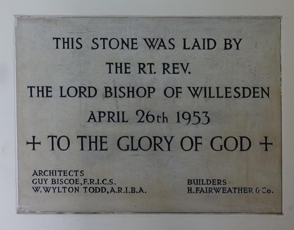 A small church well north of Wembley town centre. It dates from 1953 and is by W. Wylton Todd and Guy Biscoe, replacing a structurally compromised church of 1926. The tower was added in 1979. The stained glass is from 1954 by Hardman