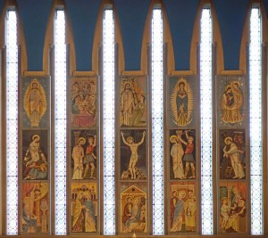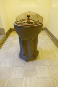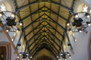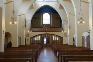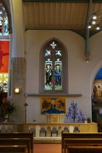 The current building is by F.G. Broadbent and dates from 1958-1962, based on H.S. Goodhart-Rendel’s designs. The chapel is divided by a grille between the lay nave and the nun’s sanctuary area.
