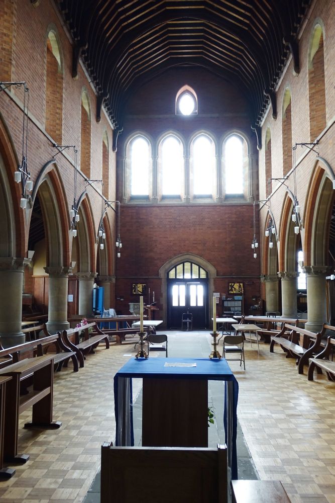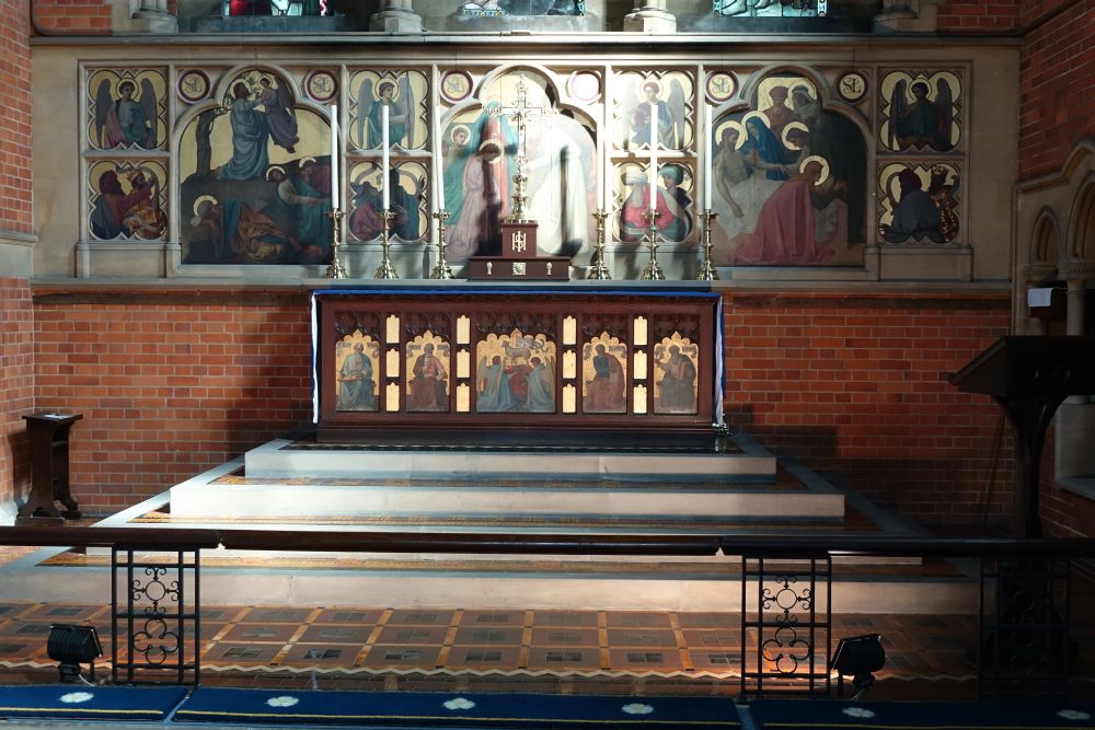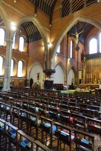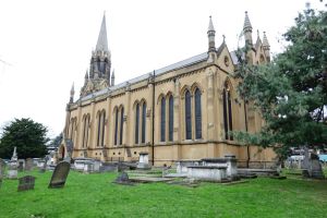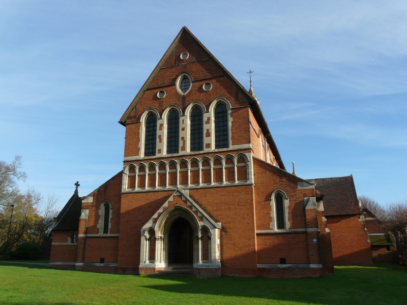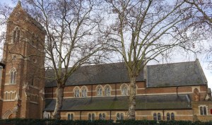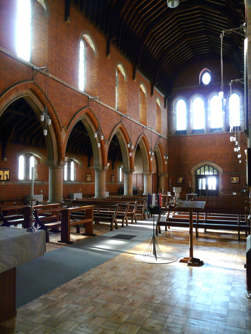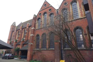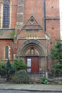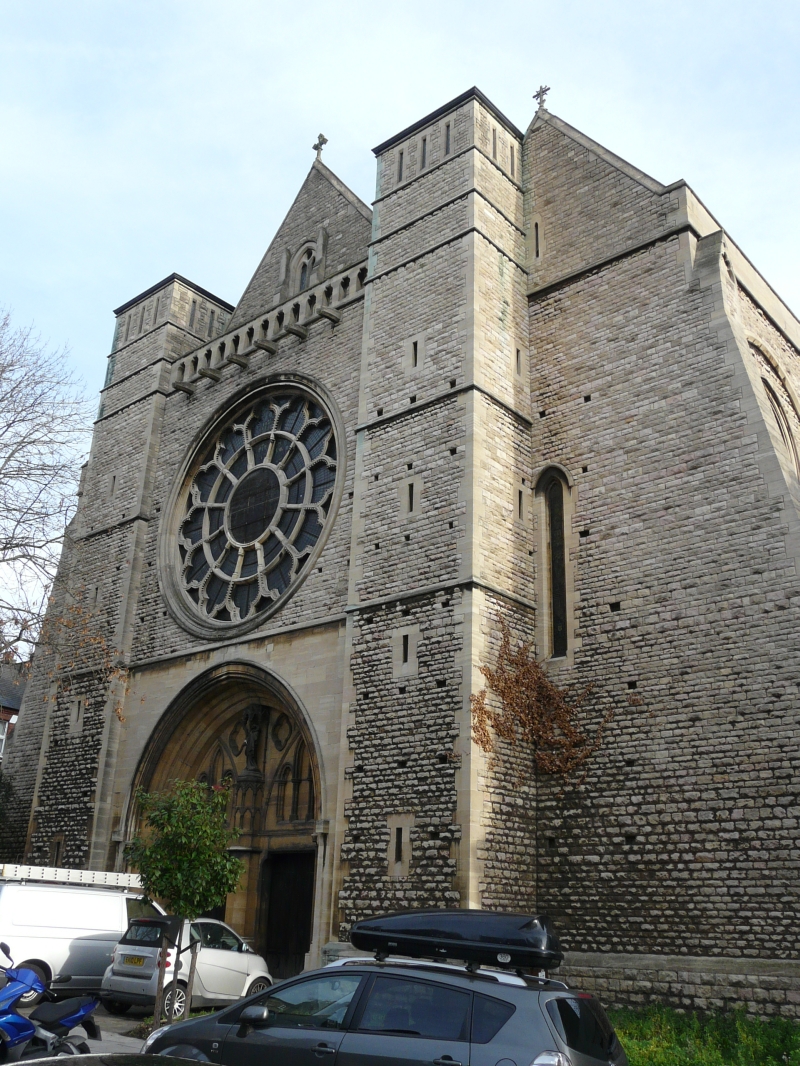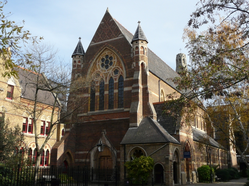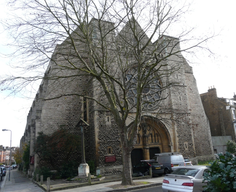 Designed by James Brooks in 1887 and built 1889-91. In 1991 the church was divided horizontally and vertically with the western end becoming halls and a nursery, leaving the transepts and chancel as the church space. The Lady Chapel at the eastern end of the south transept was also removed. Older halls to the south-east were replaced by housing. The interior is still typically Brooks and contains a huge baldacchino by Ernest Geldart and glass designed by Henry Holliday.