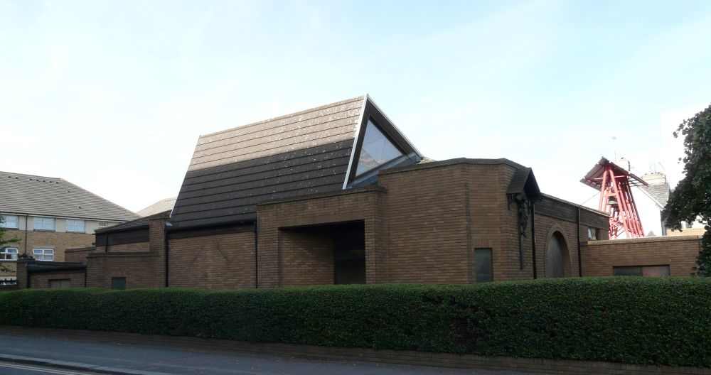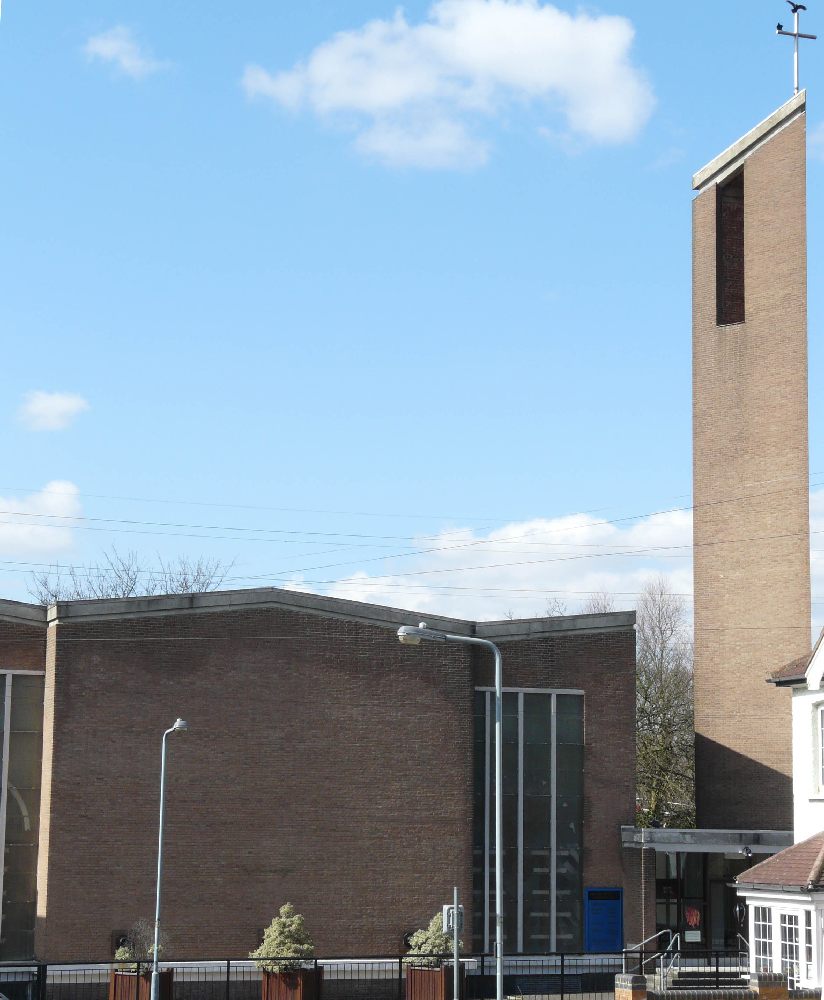 Sitting just northwest of Hayes town centre, a vast church of 1961 by Burles, Newton and Partners. The large chancel painting is by Pietro Annigioni and the glass is by Goddard and Gibbs.