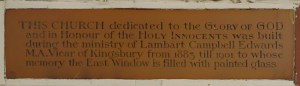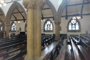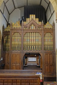 Set well back from the road between Stanmore and Harrow Weald. This church started as a chancel of 1842 designed by J.T. Harrison. Nave and aisles were added by William Butterfield in 1845. In 1889-92 he took down the north aisle and added a new gabled aisle and tower. A west gallery was added in the late fifties and the west window blocked. Removal of paint in 2013 uncovered a painted and tiled decorative scheme by Butterfield in the chancel.