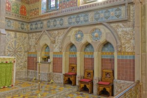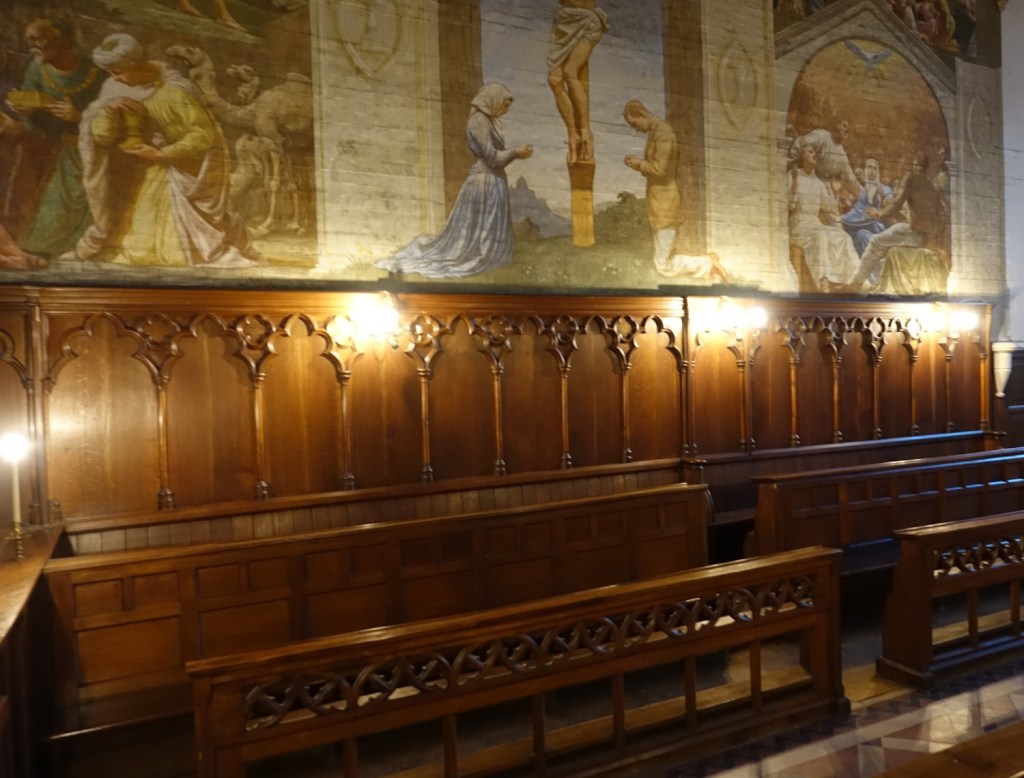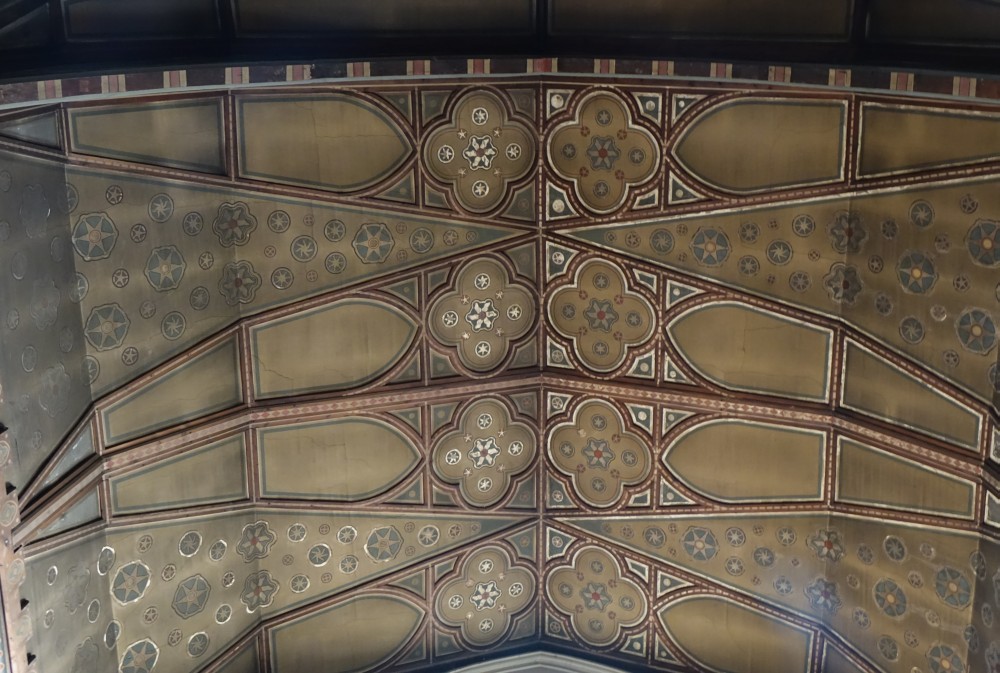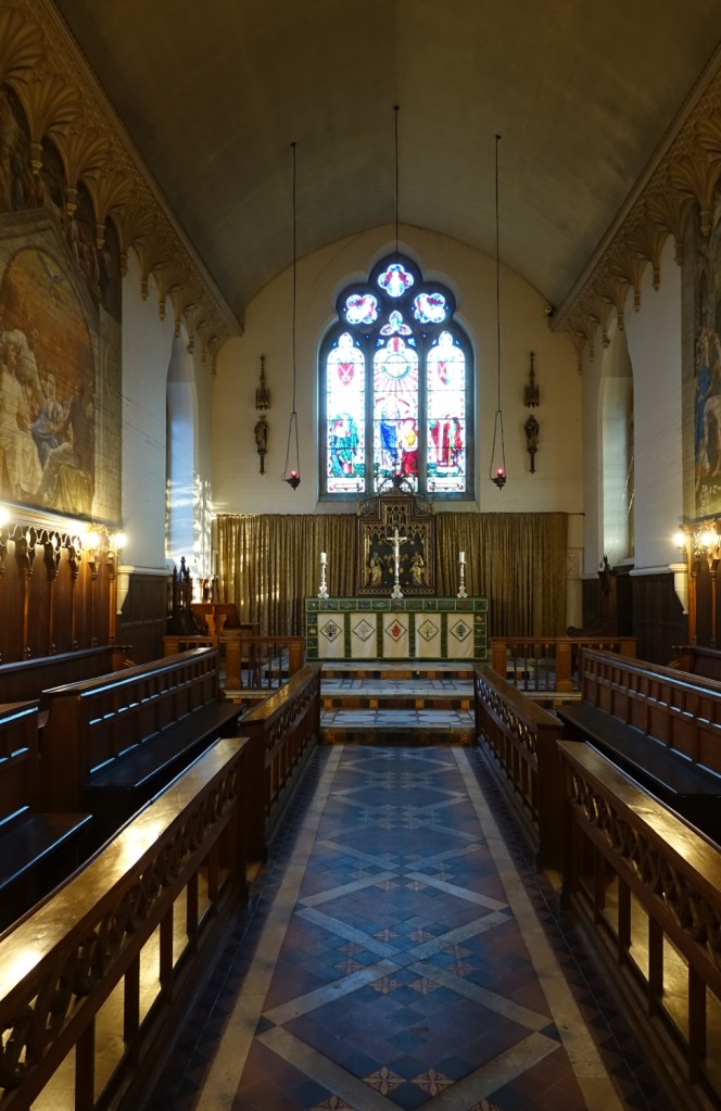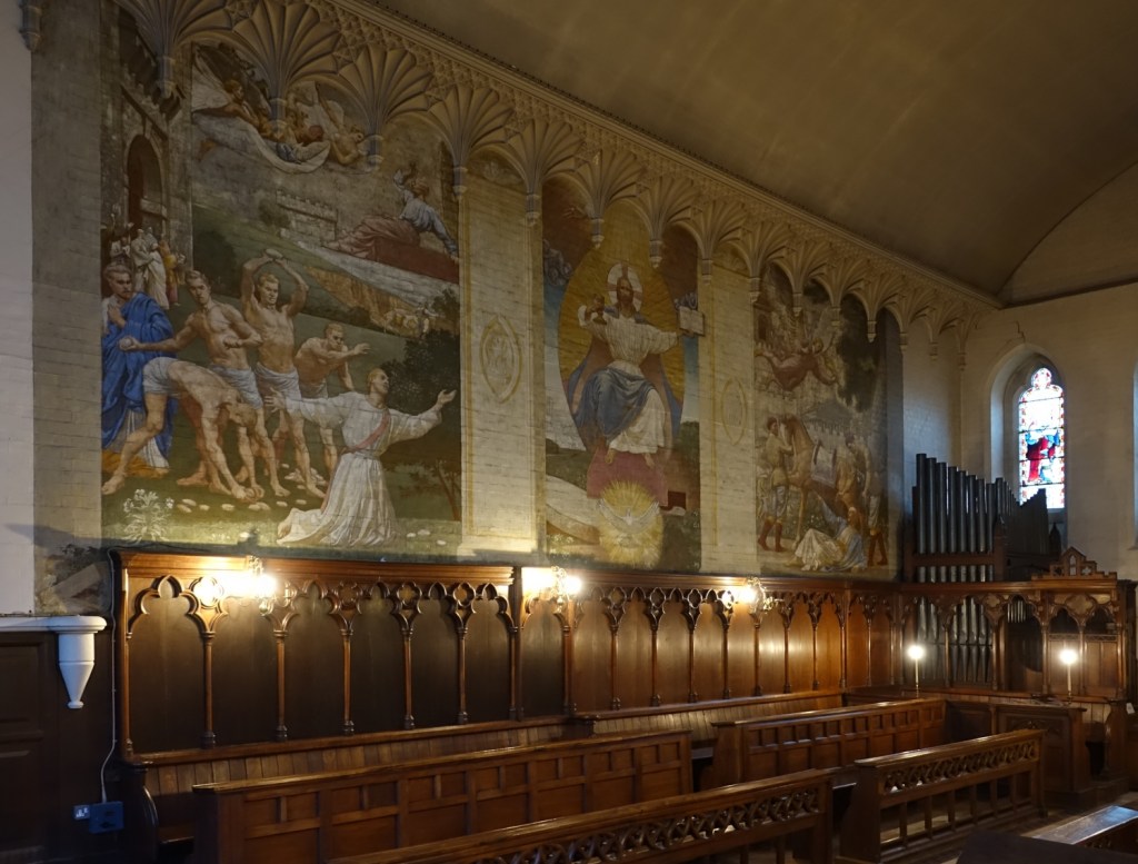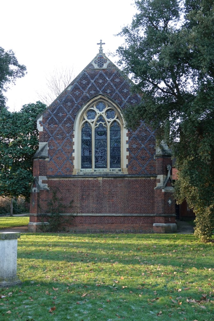 This was the chapel for the Bishops of London when they occupied Fulham Palace up until 1973. The Palace and its grounds are now open to the public. The current chapel was designed by William Butterfield and built 1866-1867. Much of the polychromatic brickwork was obscured after WW2 by the murals painted by pupils at Byam Shaw Art School. The reredos is now on the entrance wall. The east window is by Ninian Comper , the rest by Clayton & Bell.