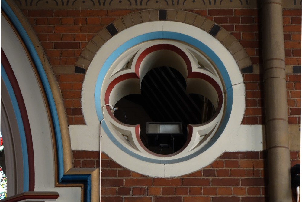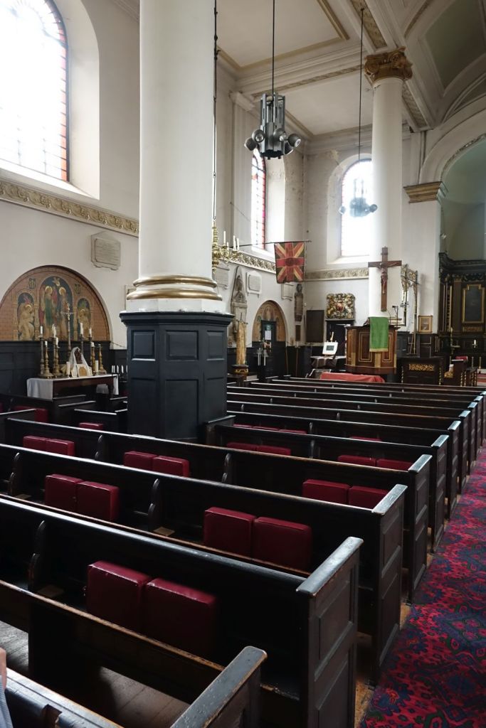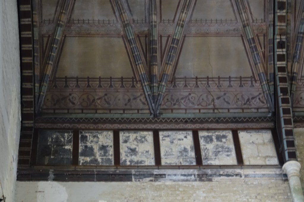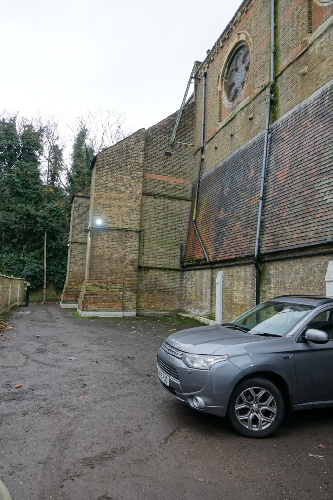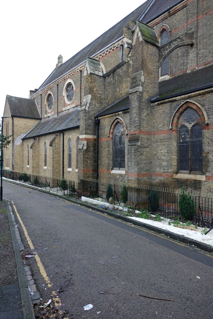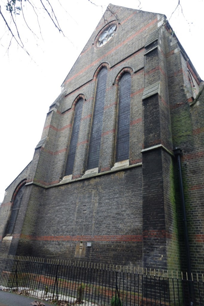Sold in 2014 to a Ghanaian church called Church of the Pentecost UK. It stands high above Woolwich Dockyard station, the chancel is by J.W. Walters dating from 1875 to which the large nave was added in 1887-1889 by William Butterfield. In 1955 Thomas F. Ford added an aisle and a transept. Inside the chancel has been blocked off to create an office and storage area, but wall decoration and screens are intact behind the wall. I suspect there is a reredos, too but it was inaccessible on my visit.