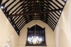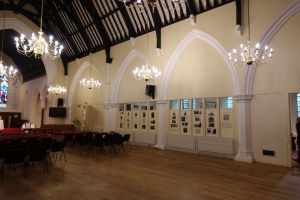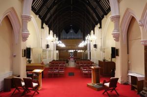 By Francis B. Newman and John Johnson 1852-54 in the centre of the square. The interior has been divided with the north aisle as rooms and the south aisle as a hall and kitchen area. The nave and chancel have been re-ordered with chairs and few of the older furnishings left.