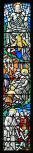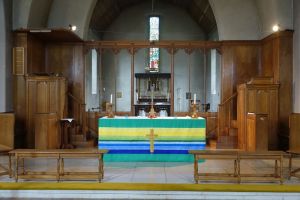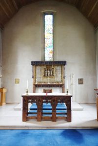 A church of 1873-74 by Ewan Christian, badly damaged in WW2 and rebuilt 1954-55 by A.P. Robinson of Caroe and Partners. At the rebuilding, the chancel was refurbished as the worship space and divided off by a glass screen from the nave which became a hall. To cope with increased use the nave is now, again, the worship space but facing the south wall, and the chancel is used for a variety of purposes. Outside the wall around the east end has been replaced by a narrow curved public cafe added since my visit in 2013. That set of images is retained at the end as a comparison with the current look of the church.