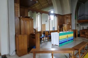 This is one of John Loughborough Pearson’s major large brick-built churches and dates from 1878-87. There are inner and outer aisles, together with an apsed Lady Chapel. The south transept was meant to be the base of a large tower that has never been completed. Although there has been considerable structural work done in 2016-2017, serous subsidence means that the south side of the nave has to be propped by large wooden buttresses. It was damaged in WW2 and restored by Caroe and Partners in 1946-51. Much of the glass by Clayton and Bell was lost at that time. Some has been replaced by 1950s windows by Francis Spear. Some older glass by Kempe and Comper survives.